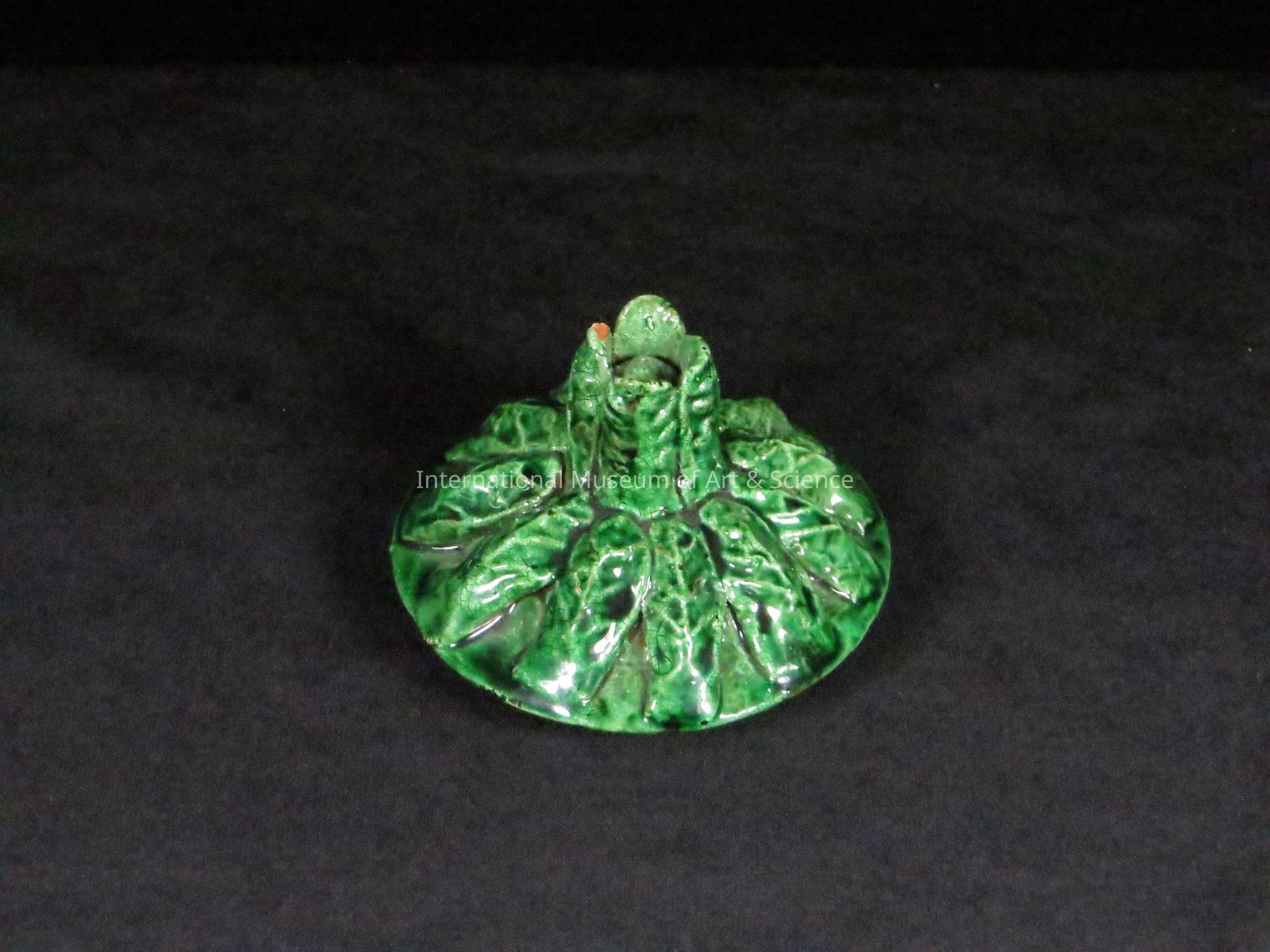 A ceramic jar. The jar has tripod legs and is in the pineapple style. It has Tripod ceramic jar in pineapple style with a leaf motif. The jar has a matching lid that looks like the leafy top of a pineapple.Dimensions