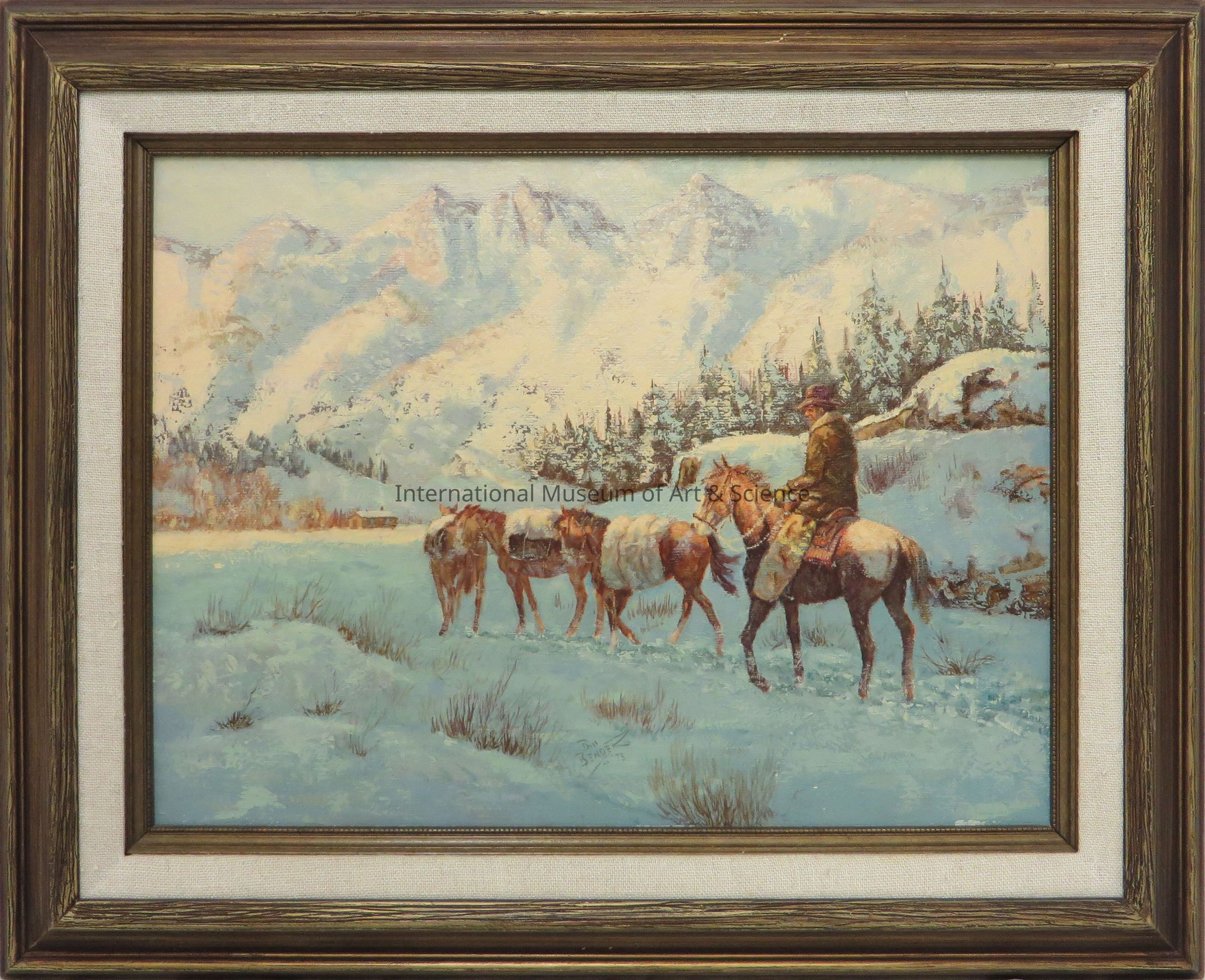 "Line Camp Ahead." Bill Bender. Depicts mounter rider; two pack horses riding from painting right to left, heavy snow, cabin stucture in far background.Dimensions