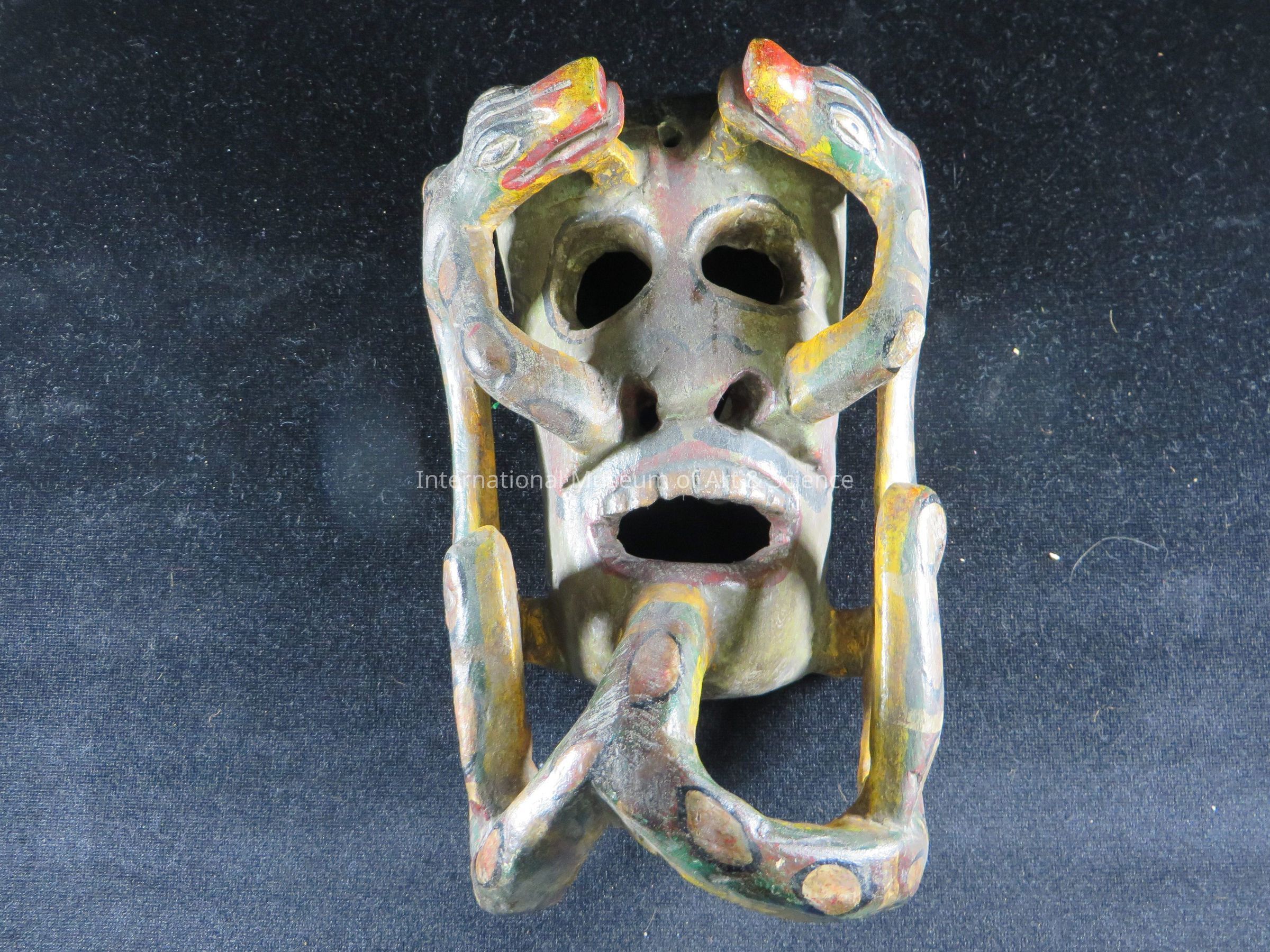 Lizard mask. Carved with two lizards on sides of face, dark green, yellow black & red paint openings at eyes, nostrils and mouth.Dimensions