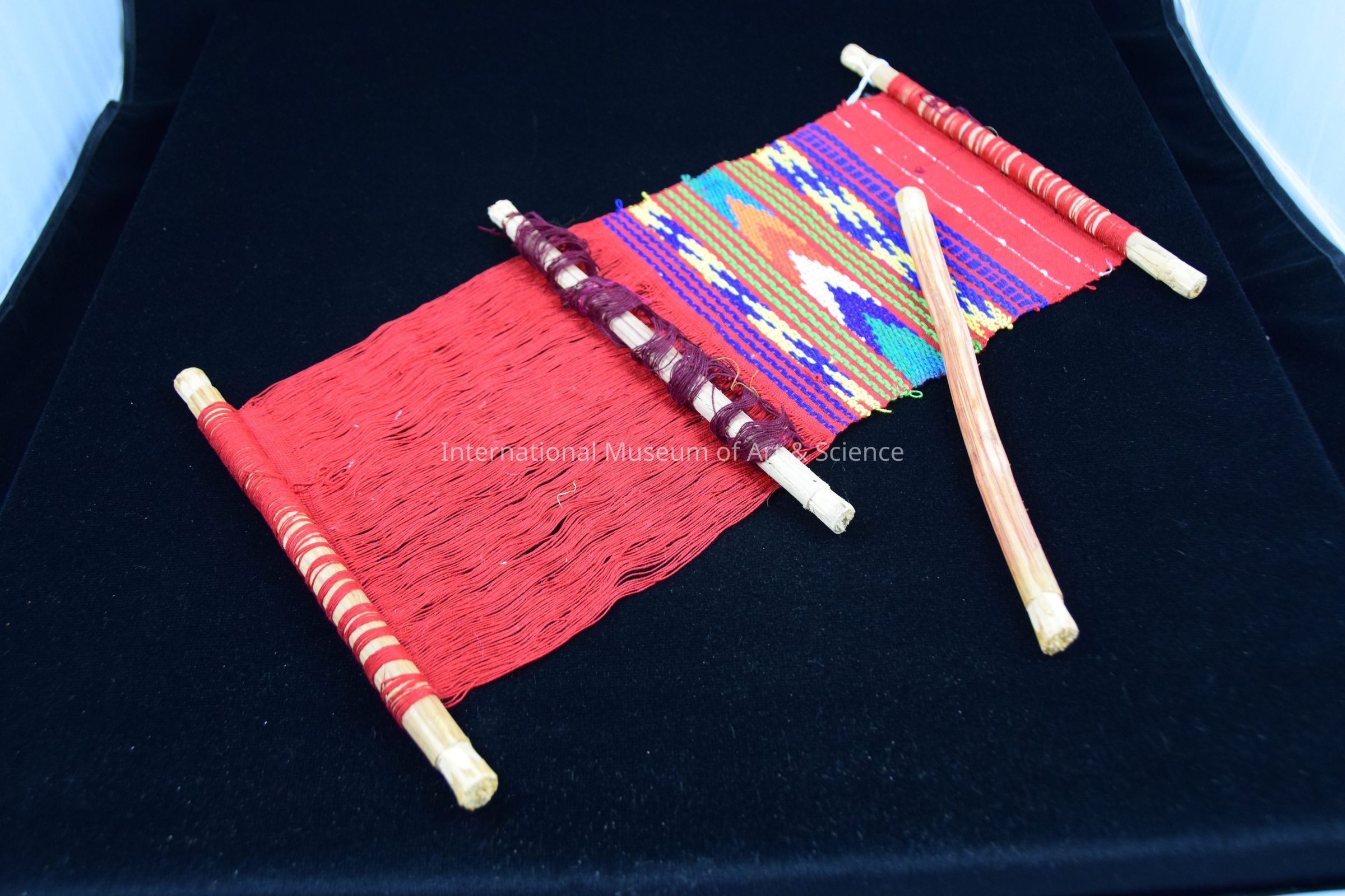 A backstrap loom. The piece is made up of four wooden dowels and weaving yarn. The yarn is lightweight cotton. There are geometric designs woven into part of the piece. The piece is still attached to three of the loom dowels.
