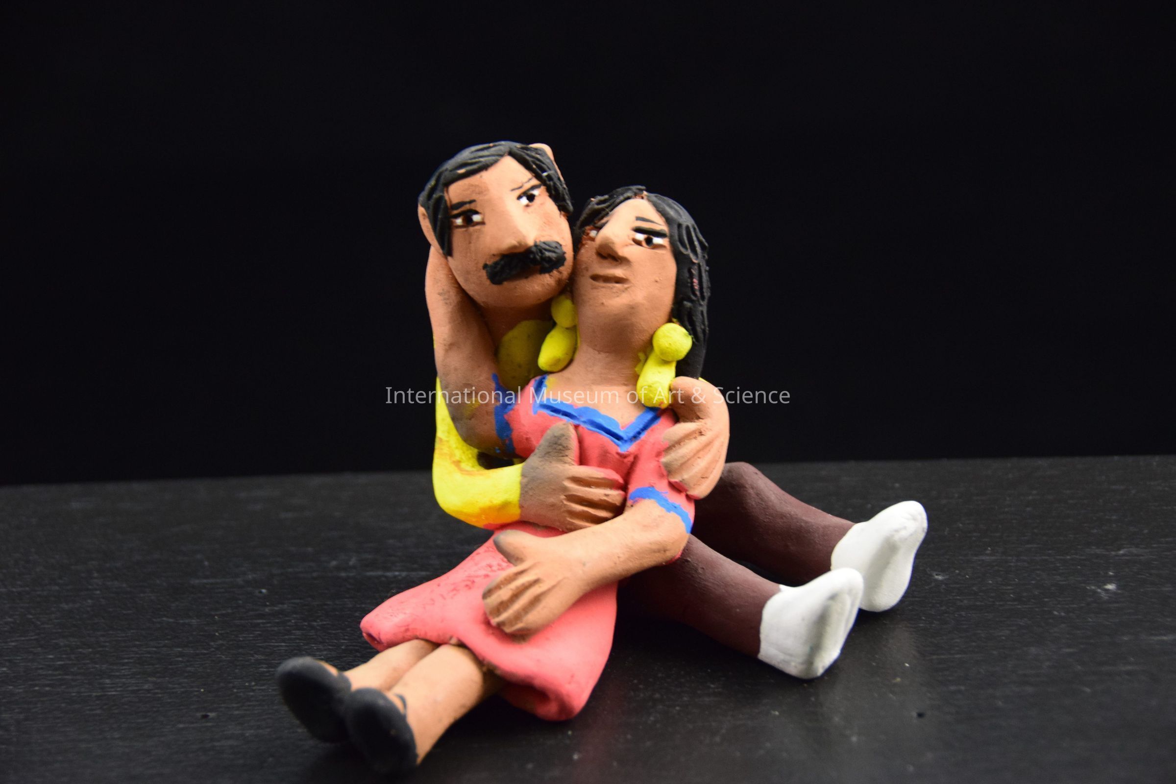 A ceramic set of two figurines. A man and a woman are seated in a cris-cross angle. The man is wearing a yellow shirt, brown pants, and white shoes. The woman wears a coral dress with blue trim at the neckline and sleeves.