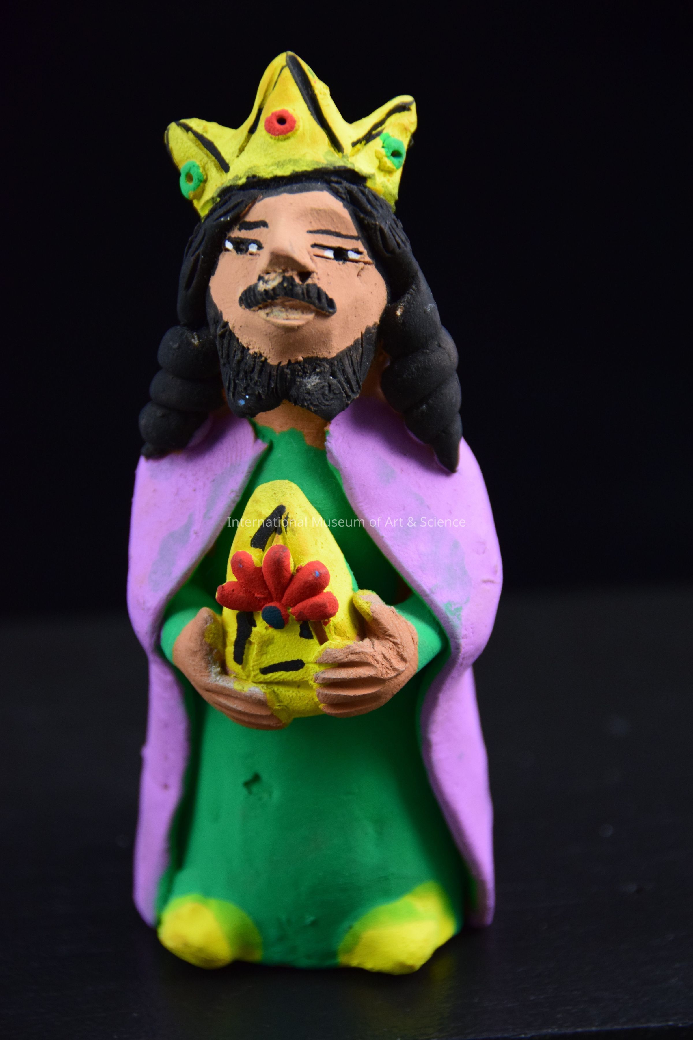 A ceramic figurine of a Wise man/Magi. He is wearing a green tunic, a purple tunic, yellow shoes, and a crown. He is holding a gift in his hands. He is part of a 13 piece Nativity scene.Dimensions