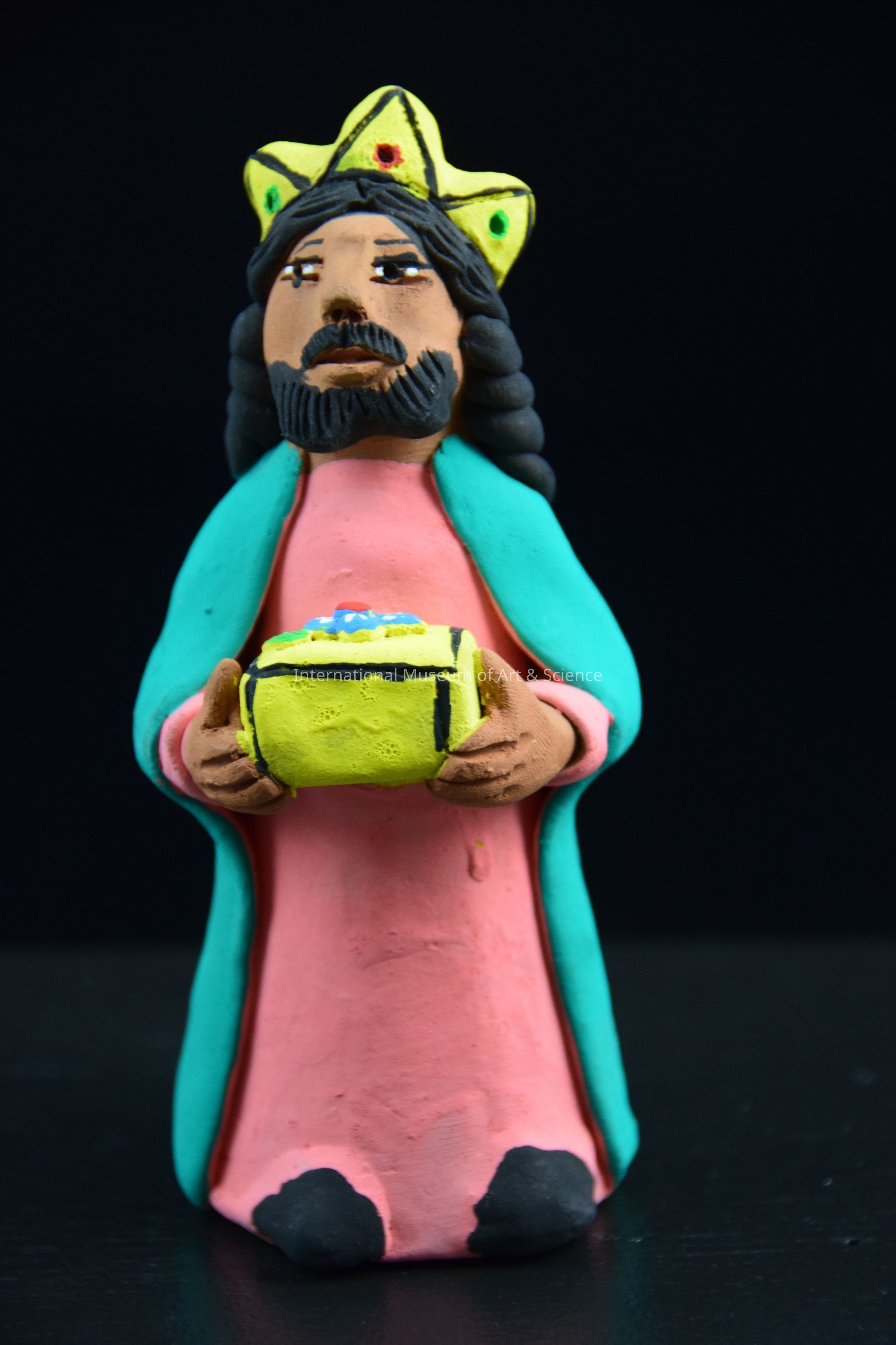 A ceramic figurine of a Wise man/Magi. He is wearing a coral tunic, a green cape, black shoes, and a crown. He is holding a gift in his hands. He is part of a 13 piece Nativity scene.Dimensions