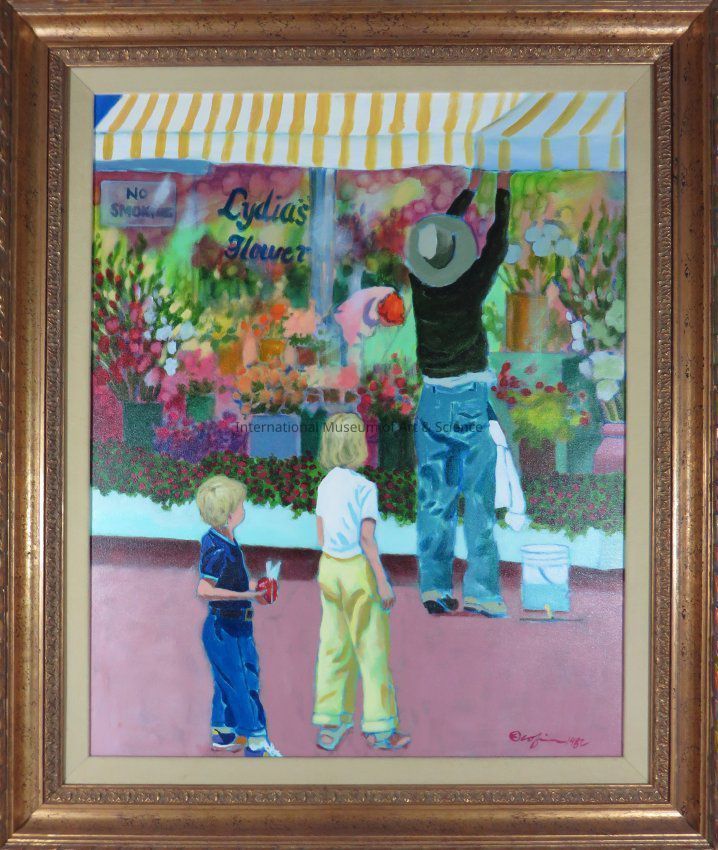 "Make a Wish" Depicts front of "Lydia's Flower" shop, wide array of colored flowers in pots and planters in front of shop. Back of window washer to viewer, reaching high under yellow/ white striped awning. Small boy and girl in foreground, observing man.Dimensions