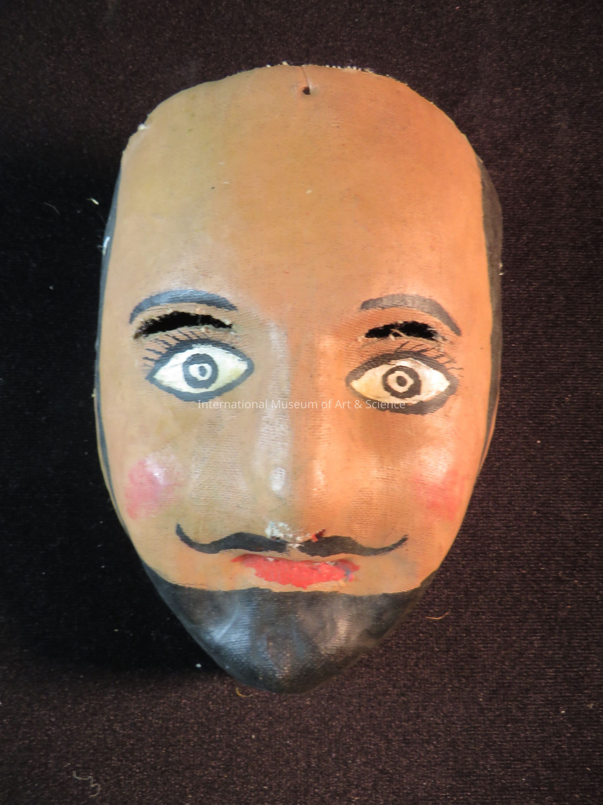 Zaachila, Oaxaca, Mexico. Male mask, Dance of the Jardineros; brownish skin; black hair and beard; protruded nose; cut slits above eyes and mouth.