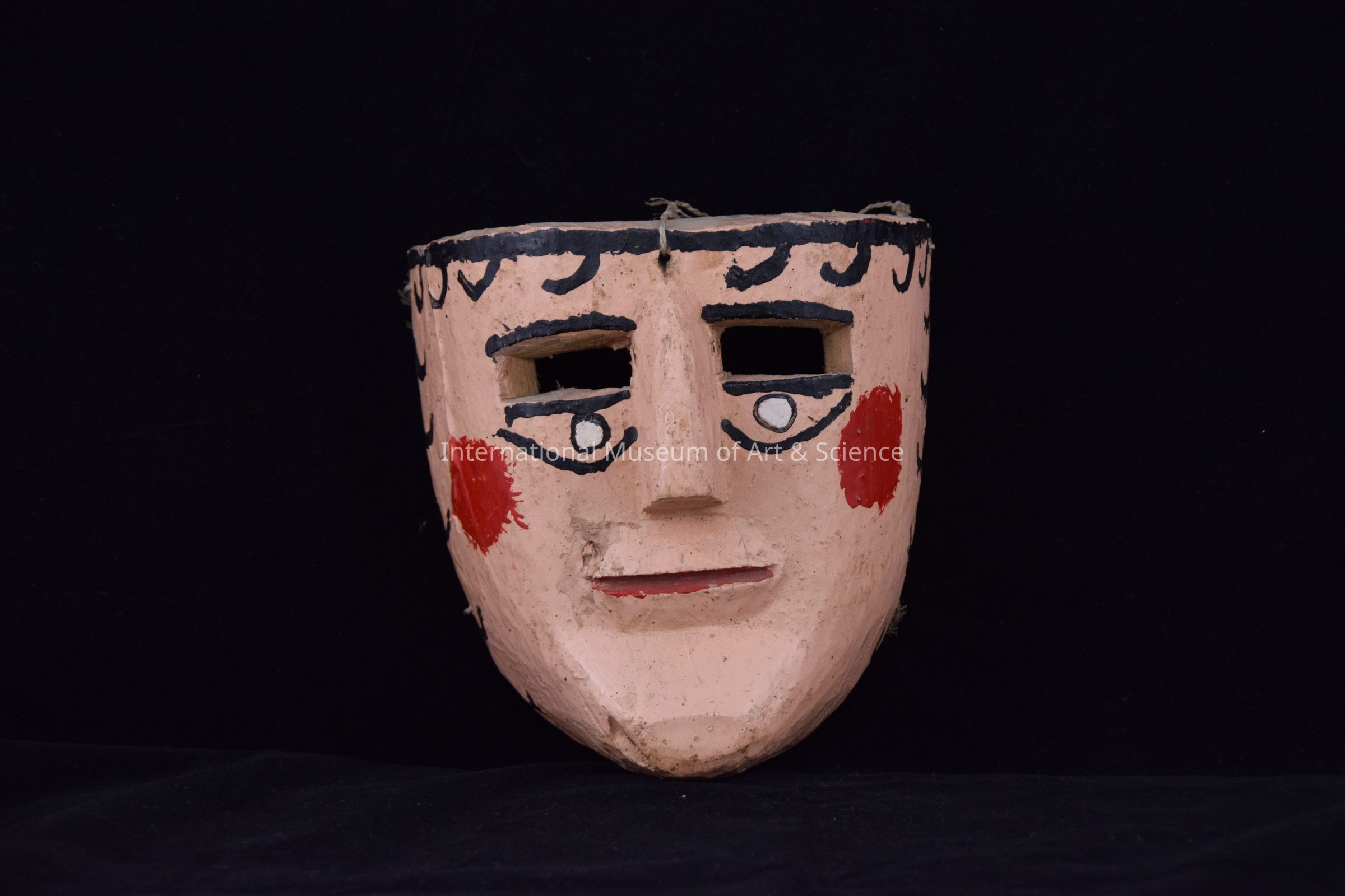 A Malinche mask (the traitor). Carved from wood the mask is painted a flesh pink color and detailed with red cheeks and black split curled hair. The mask has rectangular eye openings.Made/Created