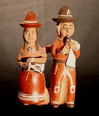 Man & wife whistle; woman with drum; man with recorder; mouth hole near bottom, back of man; sound holes behind each head at neck; woman with brown hair, man with blond; both wearing hats; earth tones.Dimensions