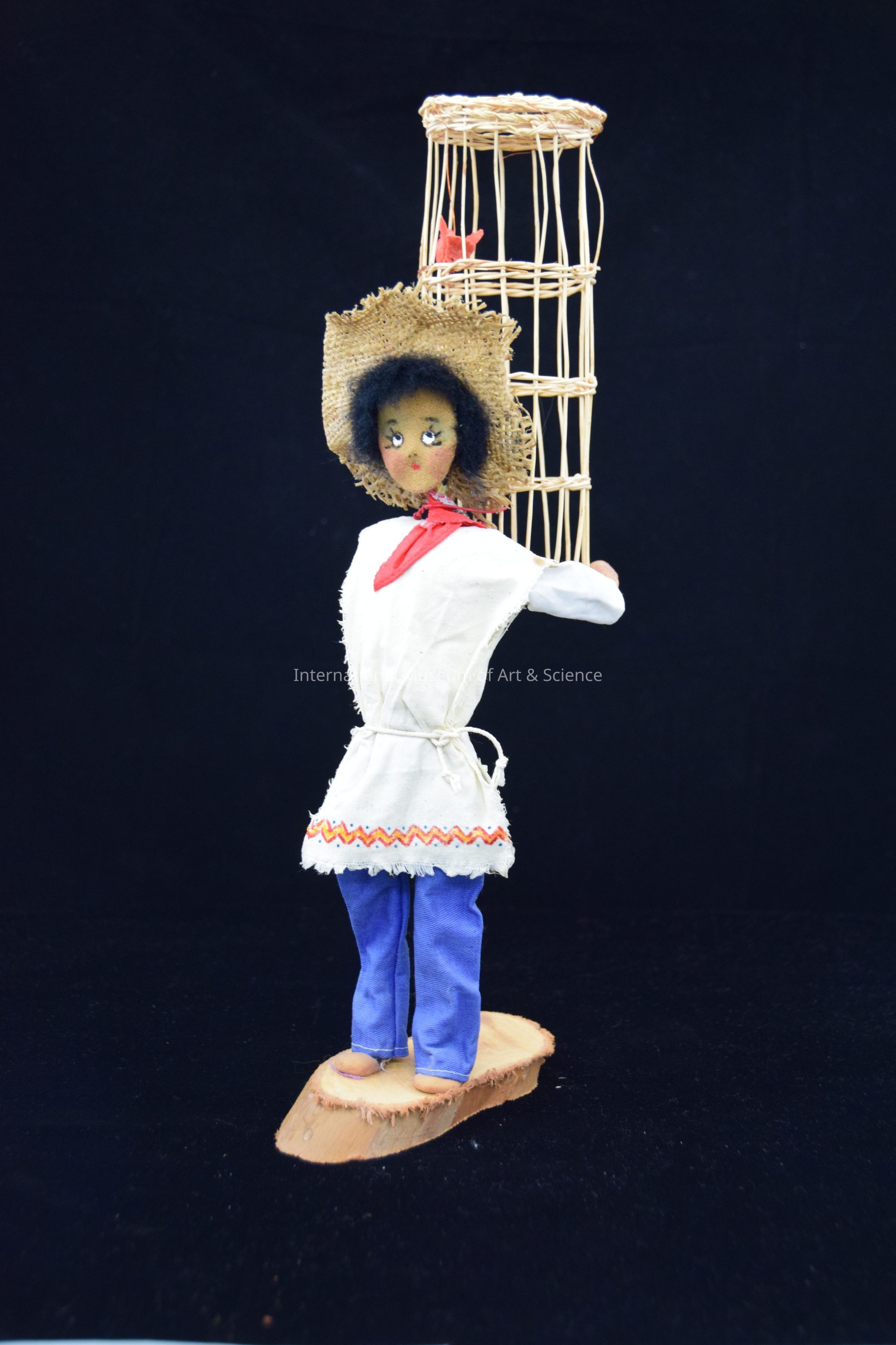 Figure of man carrying large birdcage on back in which are 3 red, yellow and white birds of clay; man is dressed in white shirt, blue pants, straw hat, red bandana at neck; all materials starched to stiffness; base of light-colored wood.Artwork Details