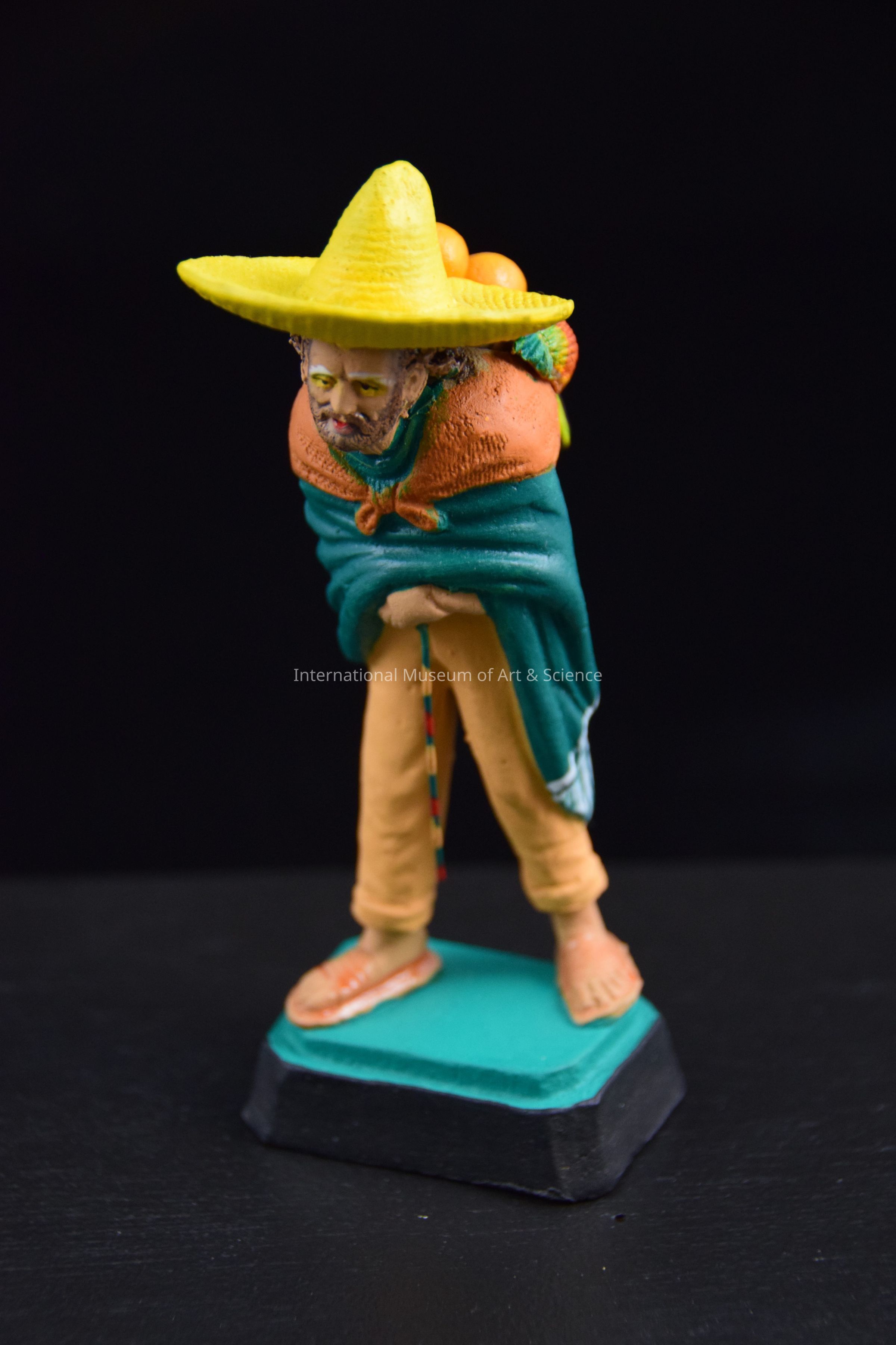 A standing figure on green with black square base. He is wearing a yellow hat, tan pants, a green sarape, and brown huaraches. he is carrying a brown morral on his back filled with oranges, bananas and pineapple. He holds a striped cane at center.Made/Created