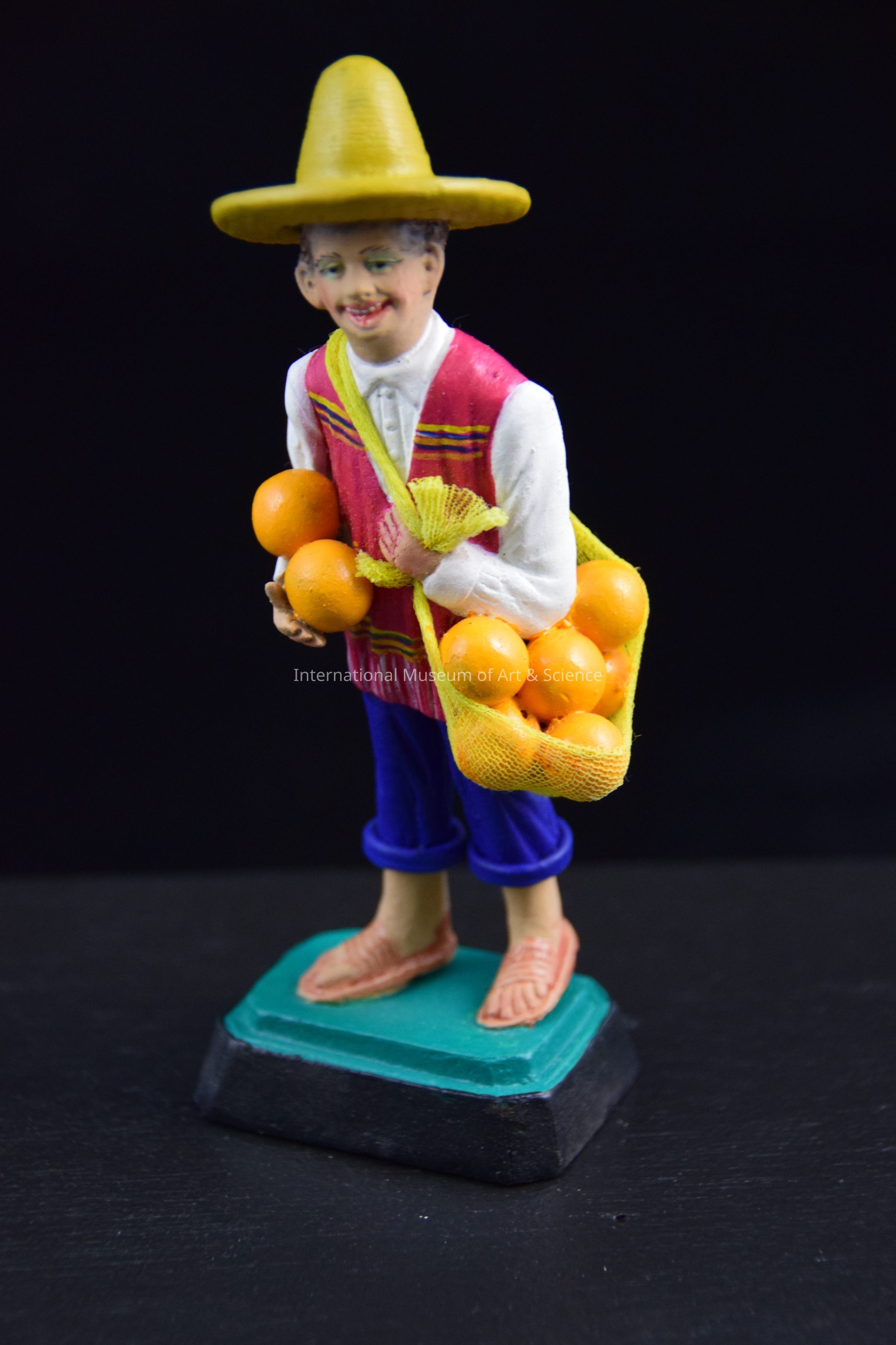 A standing figure on green with black square base. It is a smiling man with hat, white shirt under maroon pancho, dark blue pants cuffed up, and brown huaraches. He is holding a yellow netted bag filled with oranges. He holds two of the oranges in his right hand, and the netted bag in his left.Made/Created