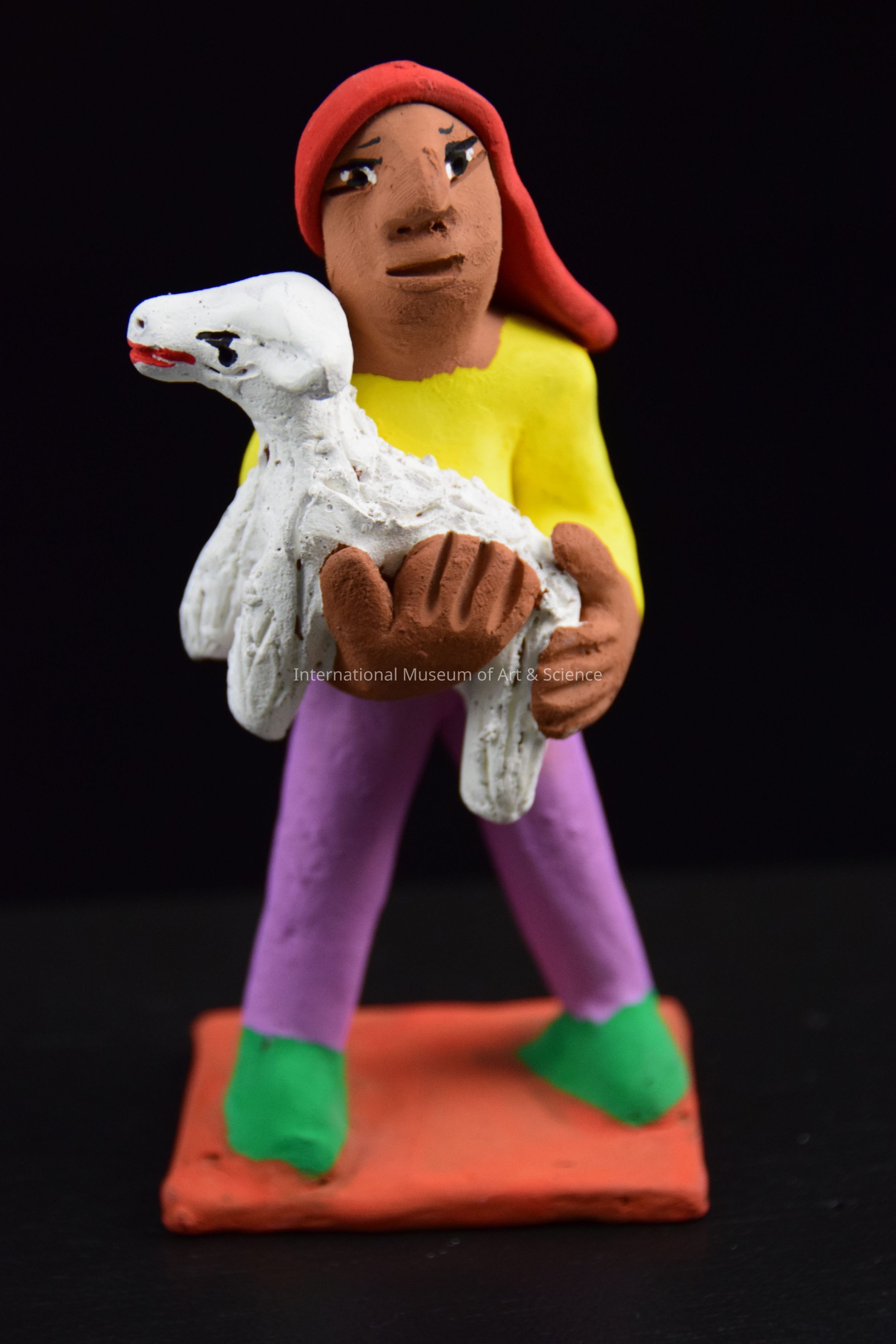 A ceramic figurine of a Shepherd. He is wearing a yellow shirt, purple pants, green shoes, and a red cap. He is holding a lamb in his arms. He is part of a 13 piece Nativity scene.Dimensions