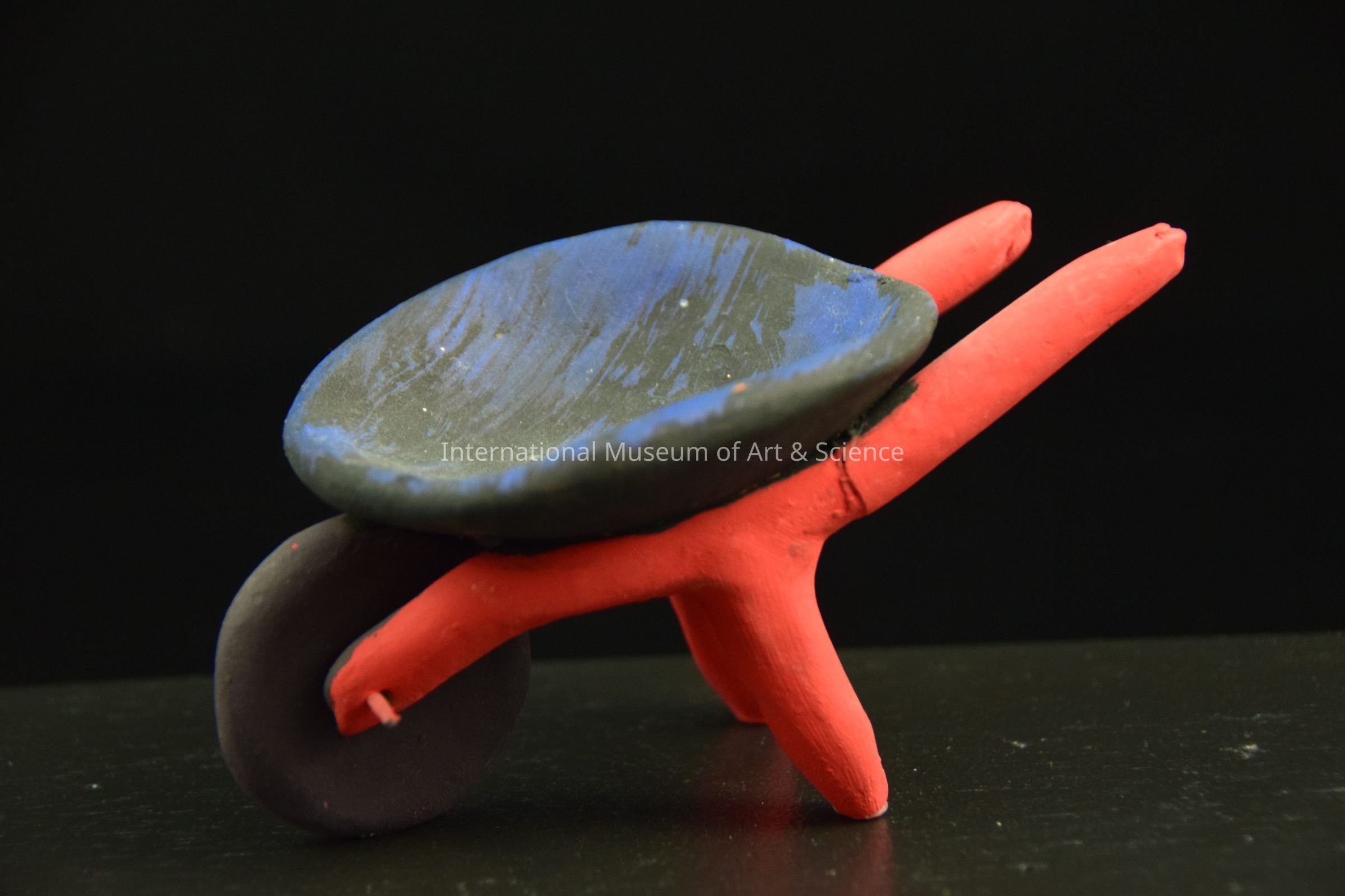 A ceramic figurine of a wheelbarrow. The bason of the piece is paint black and blue. The supports are painted red and the wheel is black and is attached with wire.