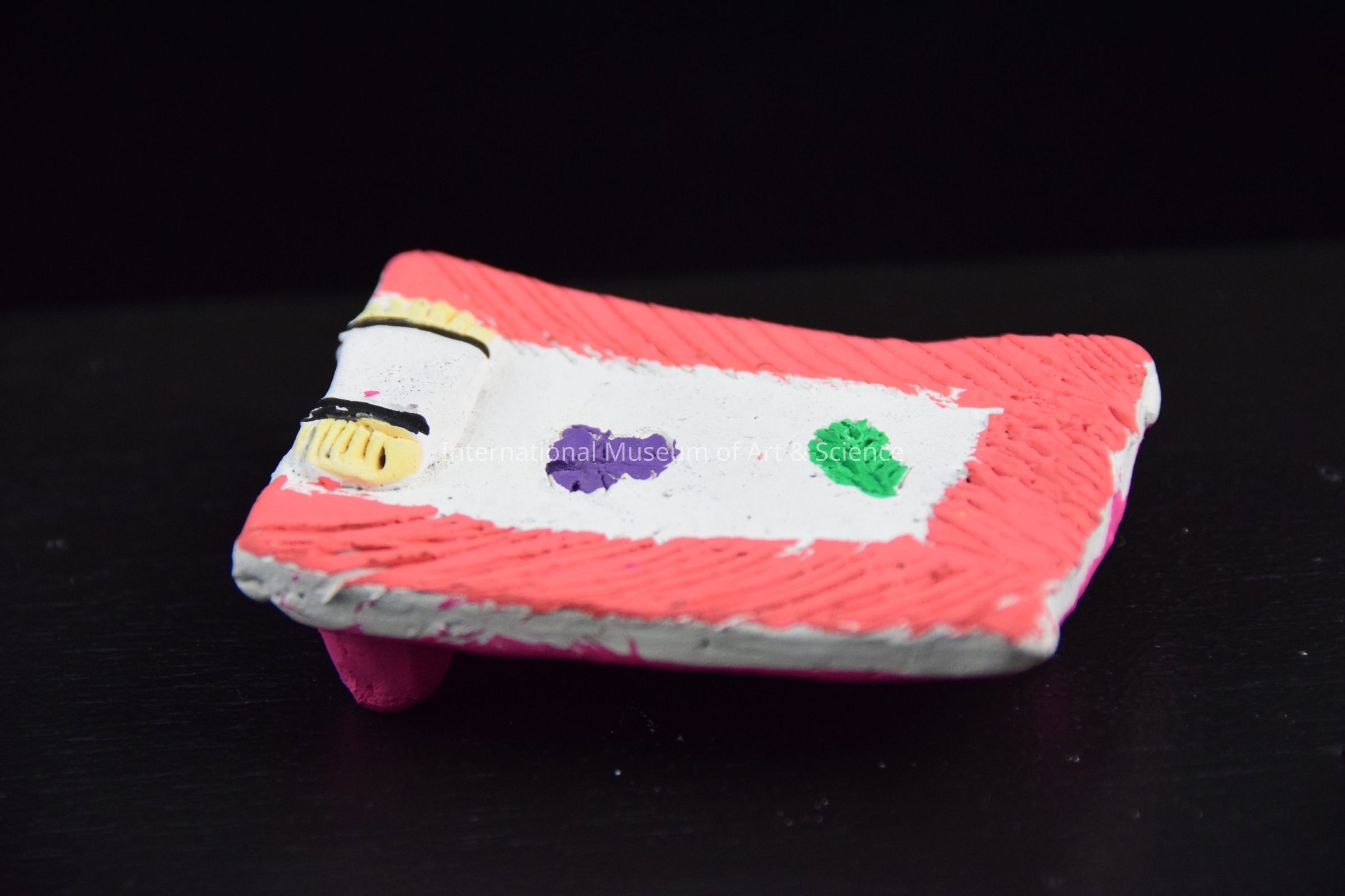 A ceramic manger. It is a flat clay crib with three small feet supporting it. It is part of a 13 piece Nativity scene.Dimensions
