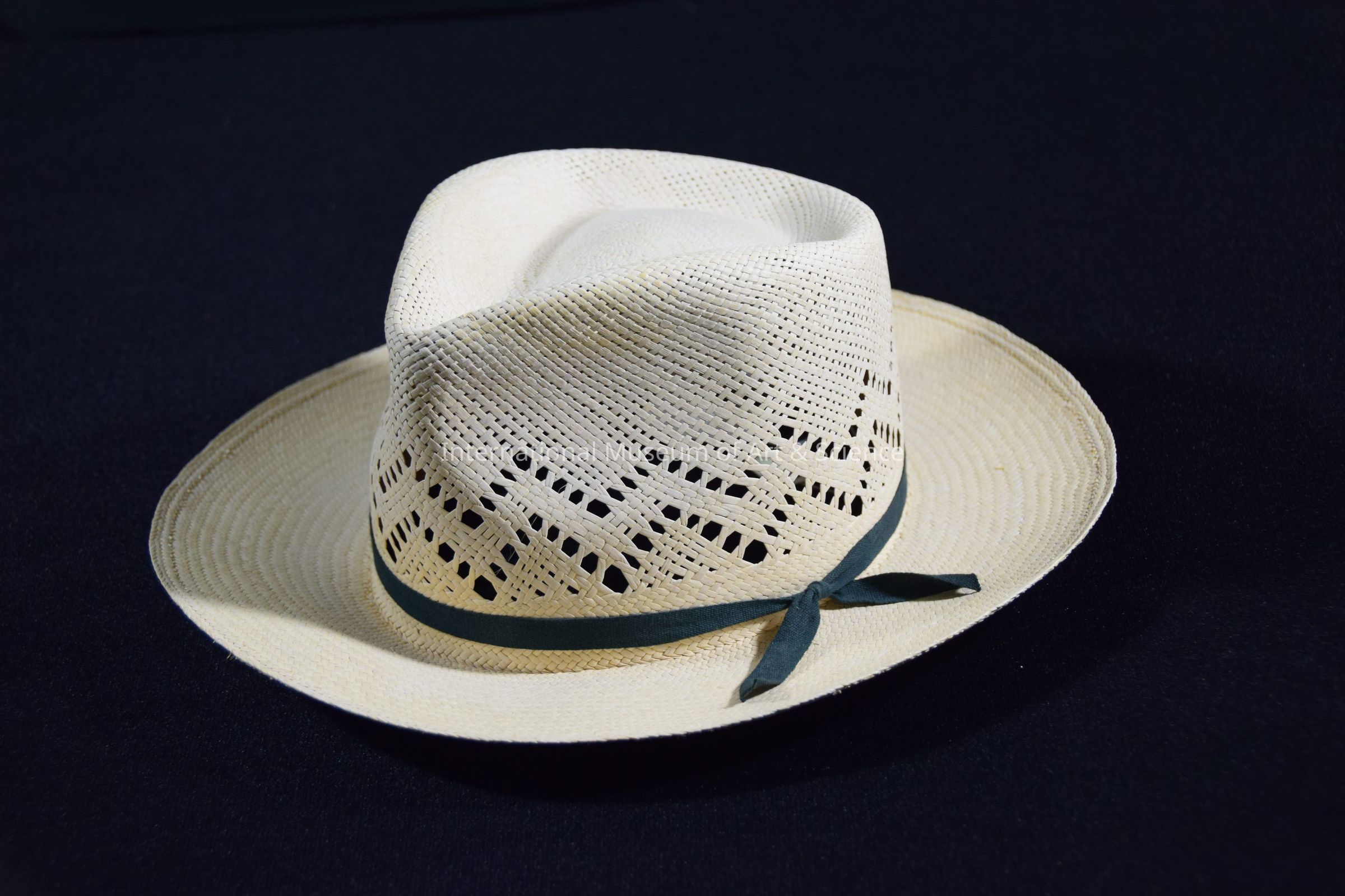 Man's Hat. Hat woven of very fine, off-white jipi leaves; hat is adorned with a black cotton band on the brim; top of hat is woven with scalloped openings in two rows; concave crown, round rim; overall natural cream color.Dimensions