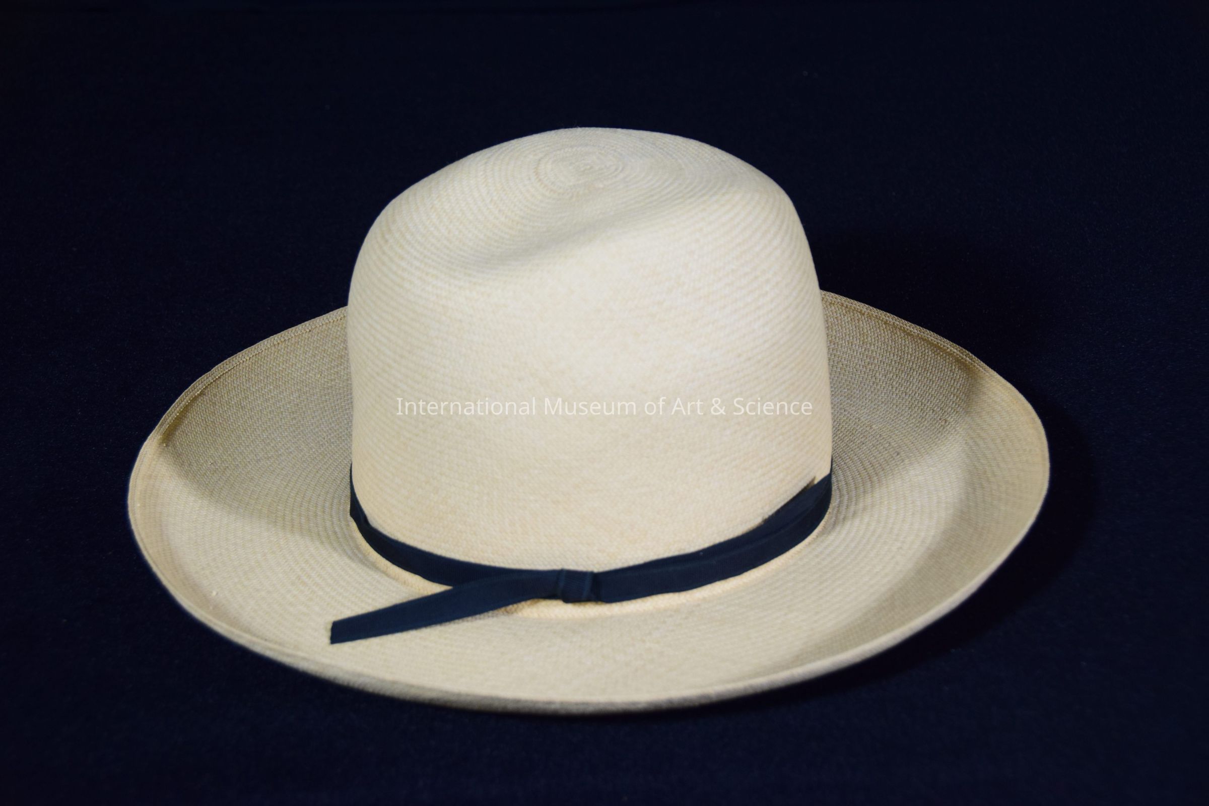 Man's hat. Man' s hat woven with very fine palm leaves of antural cream color, large round trim; high convex crwon; black cloth headband in circles; the base of crown tied in a loose knot.Dimensions