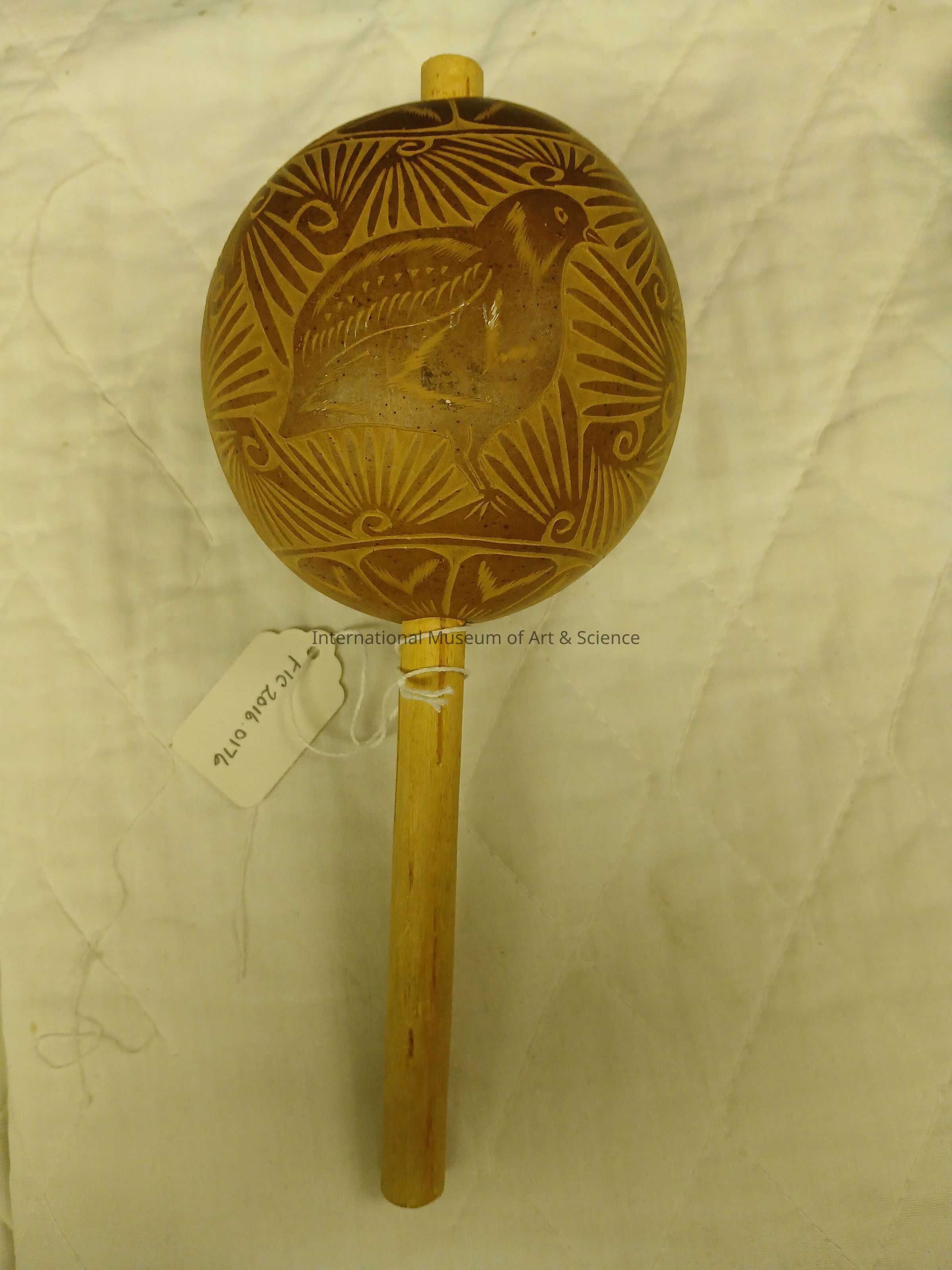 An ornate maraca carved from a gourd and attached to a wooden dowel. It has intricate carvings depicting birds, feathers and other geometric shapes and patterns.Dimensions