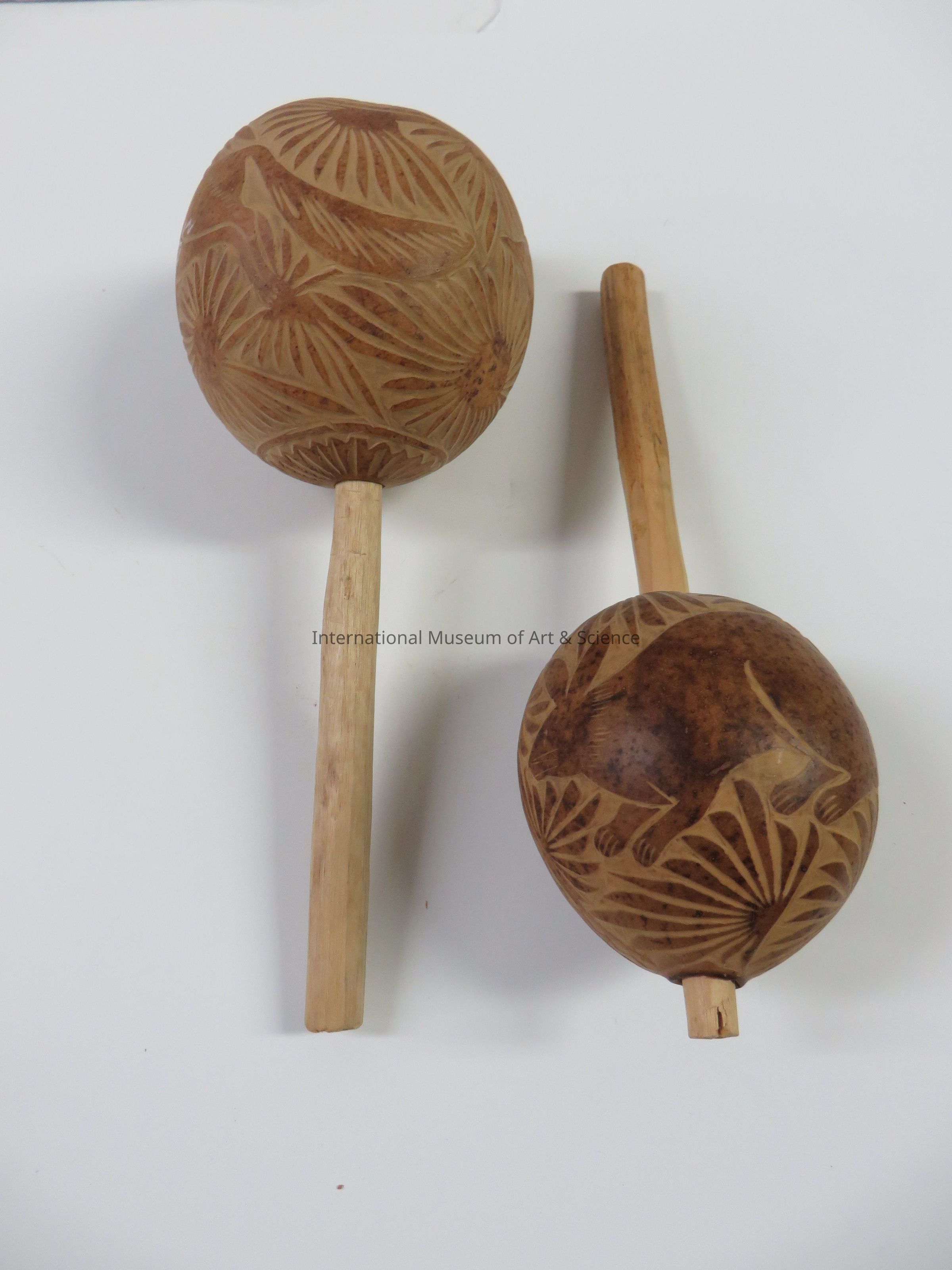A wooden and natural gourd maraca (rattle). The gourd has be carved with a rabbit motif.