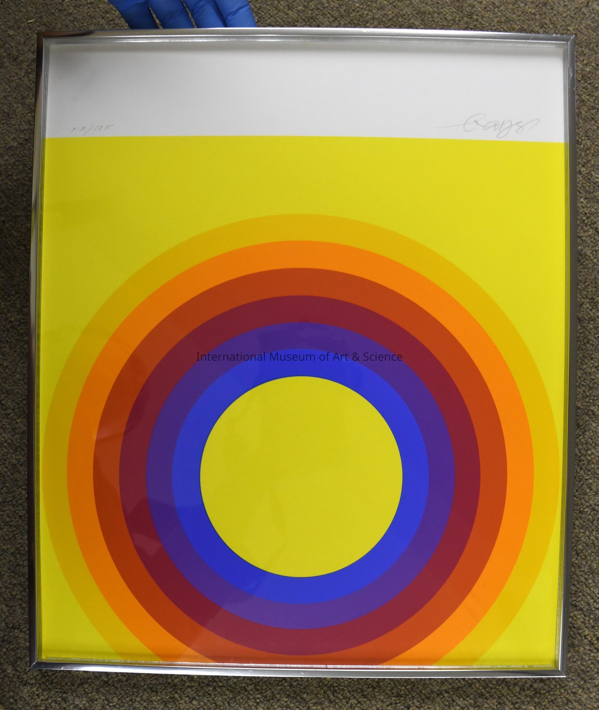 "March". Printed in Stuttgart, West Germany with multi-colored rings; bright yellow background; solid-colored circles; center is yellow followed by blue, purple, red, red-orange, orange and beige.Dimensions
