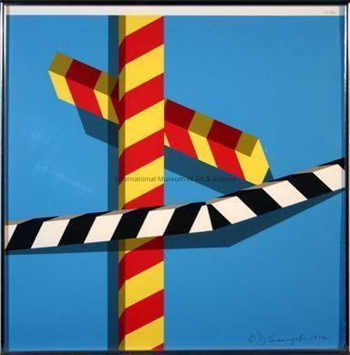 "March". Allan D'Arcangelo, American. Silkscreen. 1972. Printed in Stuttgart, West Germany with three striped bars over bright blue background; horizontal with bend is black and whole; underneath is a vertical bar with wide red and yellow stripes; followed by a short diagonalbar also with yellow and red wide stripes; gray bar shadows; 62/130.Dimensions