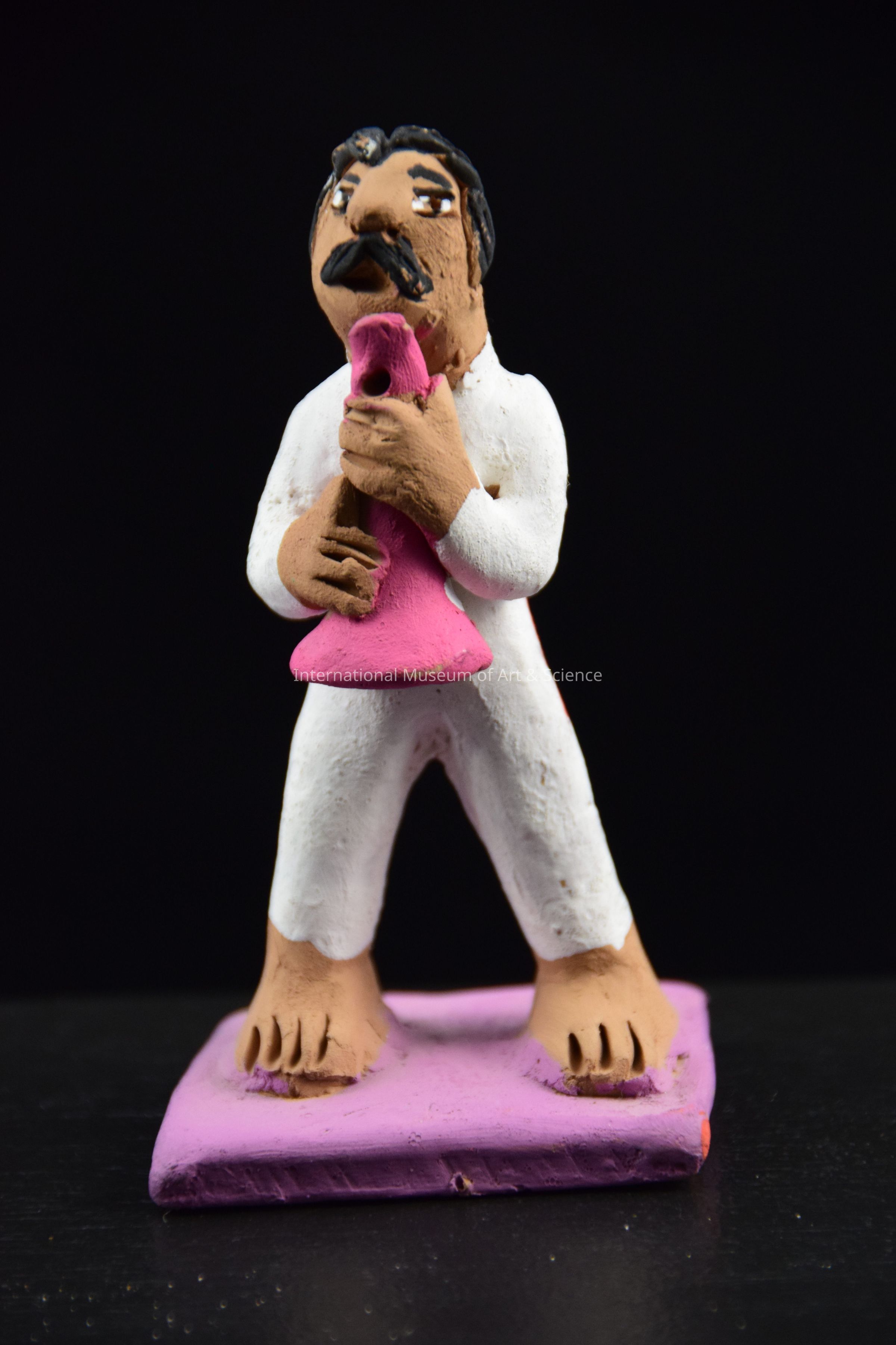 A ceramic figurine of a man playing a clarinet. He is wearing a white shirt, an orange belt, and white pants. He is holding a pink clarinet with both hands. He is part of a group of musicans.