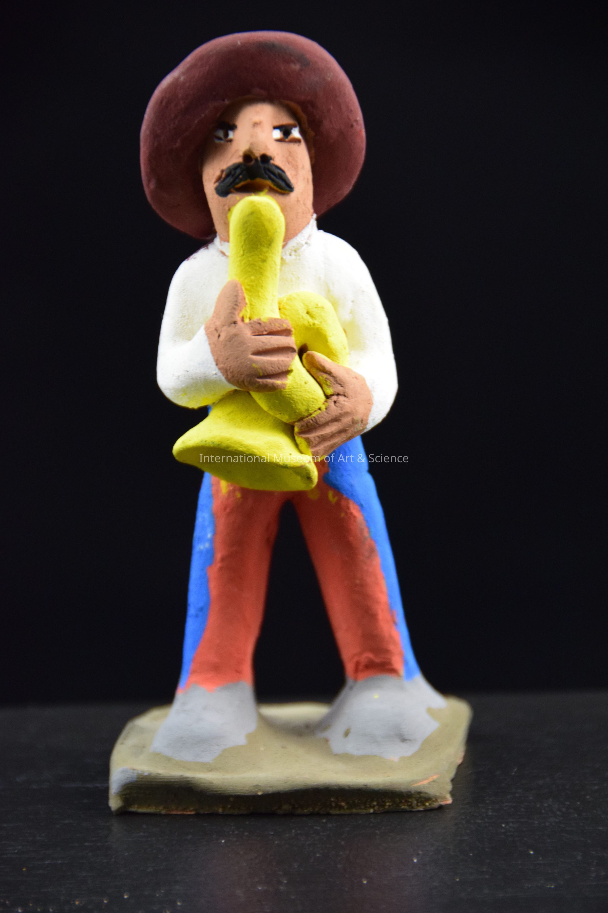 A ceramic figurine of a man playing a horn. He is wearing a white shirt, a brown hat, and orange pants with blue stripes. He is holding a yellow horn with both hands. He is part of a group of musicans.