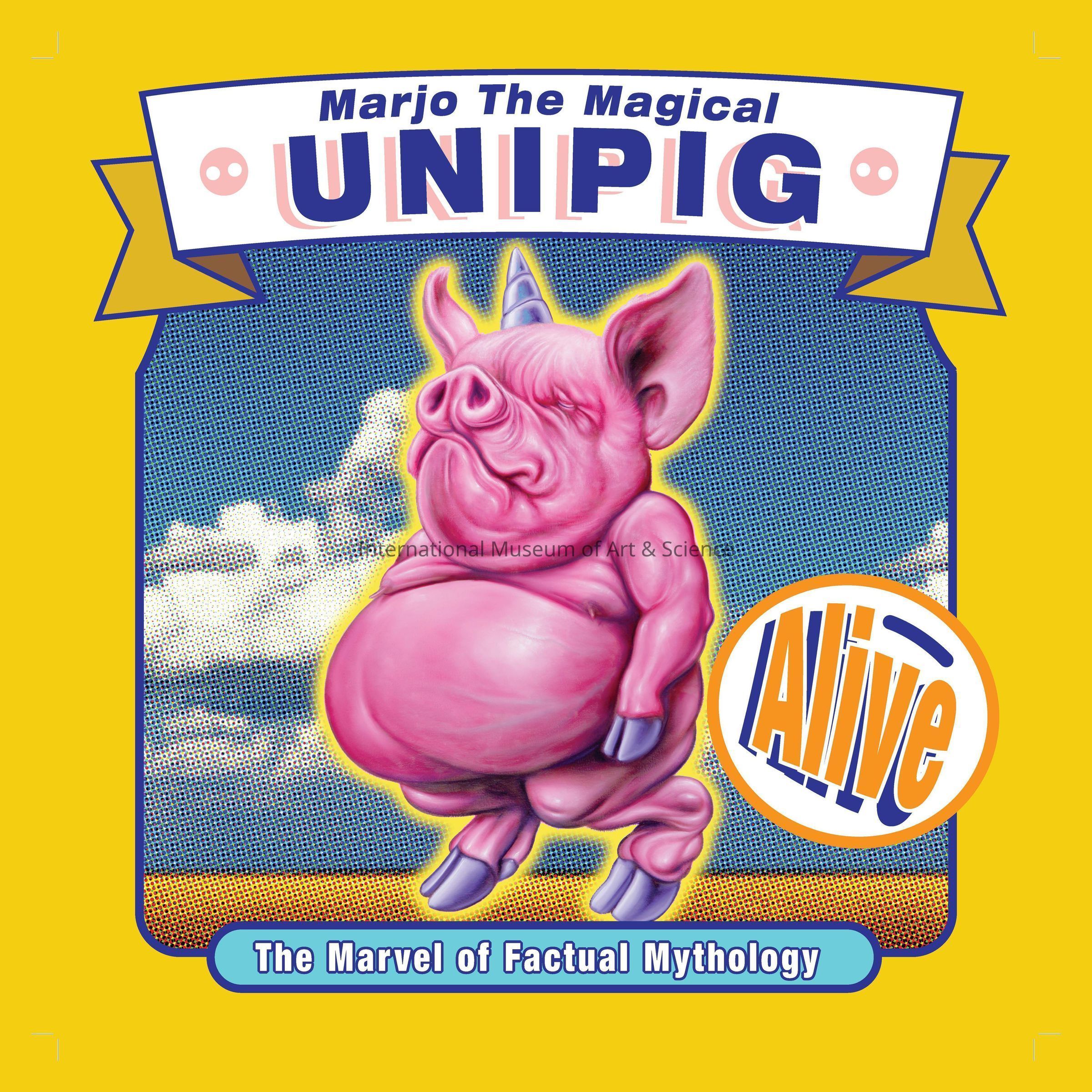 "Marjo The Magical Unipig." Ron English, American. Digital Print, 2011. Side Show format, yellow border with a obese pink pig with a unicorn horn as the central figure. Wording around the central figure: "Marjo The Magical Unipig," "Alive," and "The Marvel of Factual Mythology."