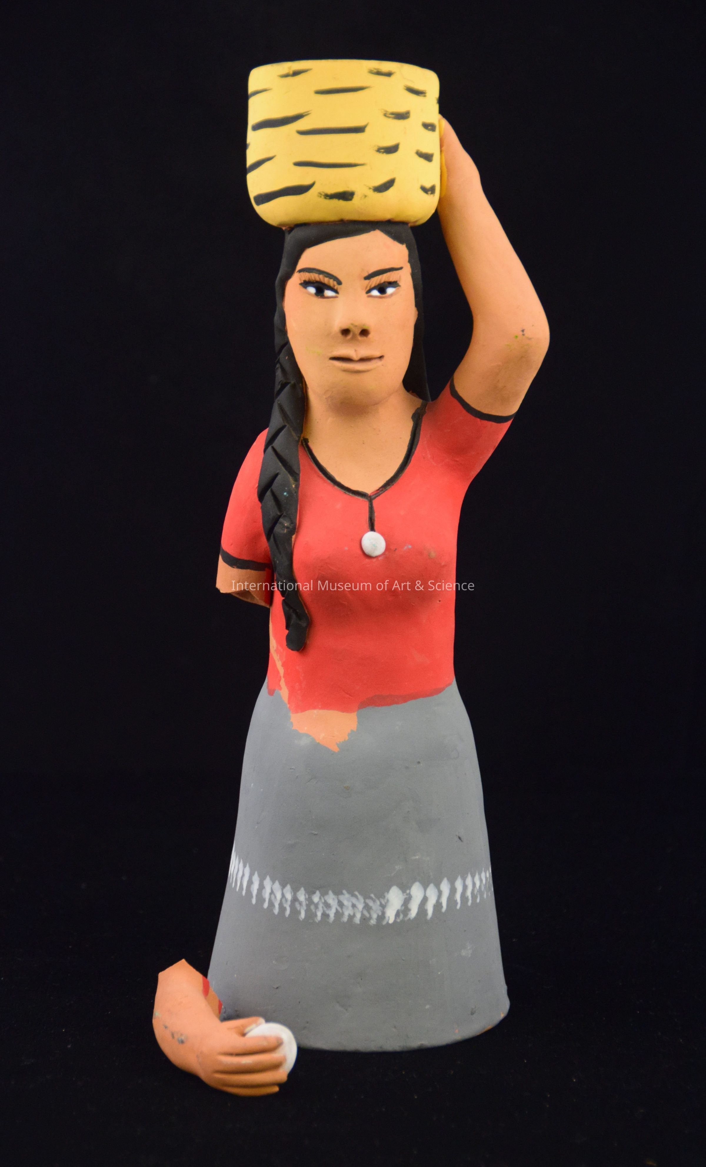A ceramic figurine of a woman. The piece is painted to show the woman wearing a red blouse, a grey skirt, with her hair braided in two bairds. The figure is holding a basket on her head with her left hand. Her right hand holds a white bread roll. The right arm has broken off the main body.Ethnography