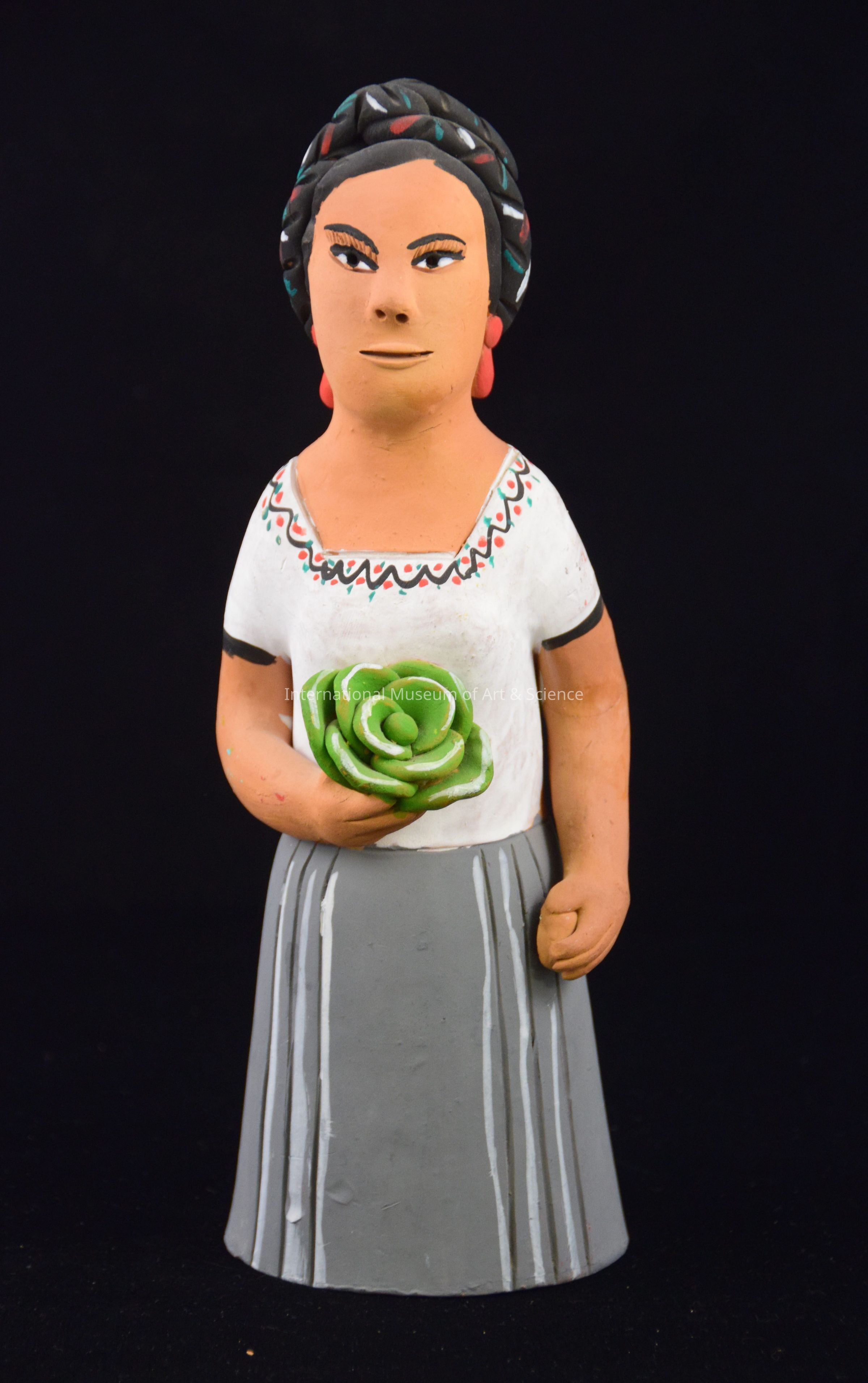 A ceramic figurine of a woman. The piece is painted to show the woman wearing a white blouse, a grey skirt, and red earrings, with her hair braided. The figure is holding a bundle of cabbage.Ethnography