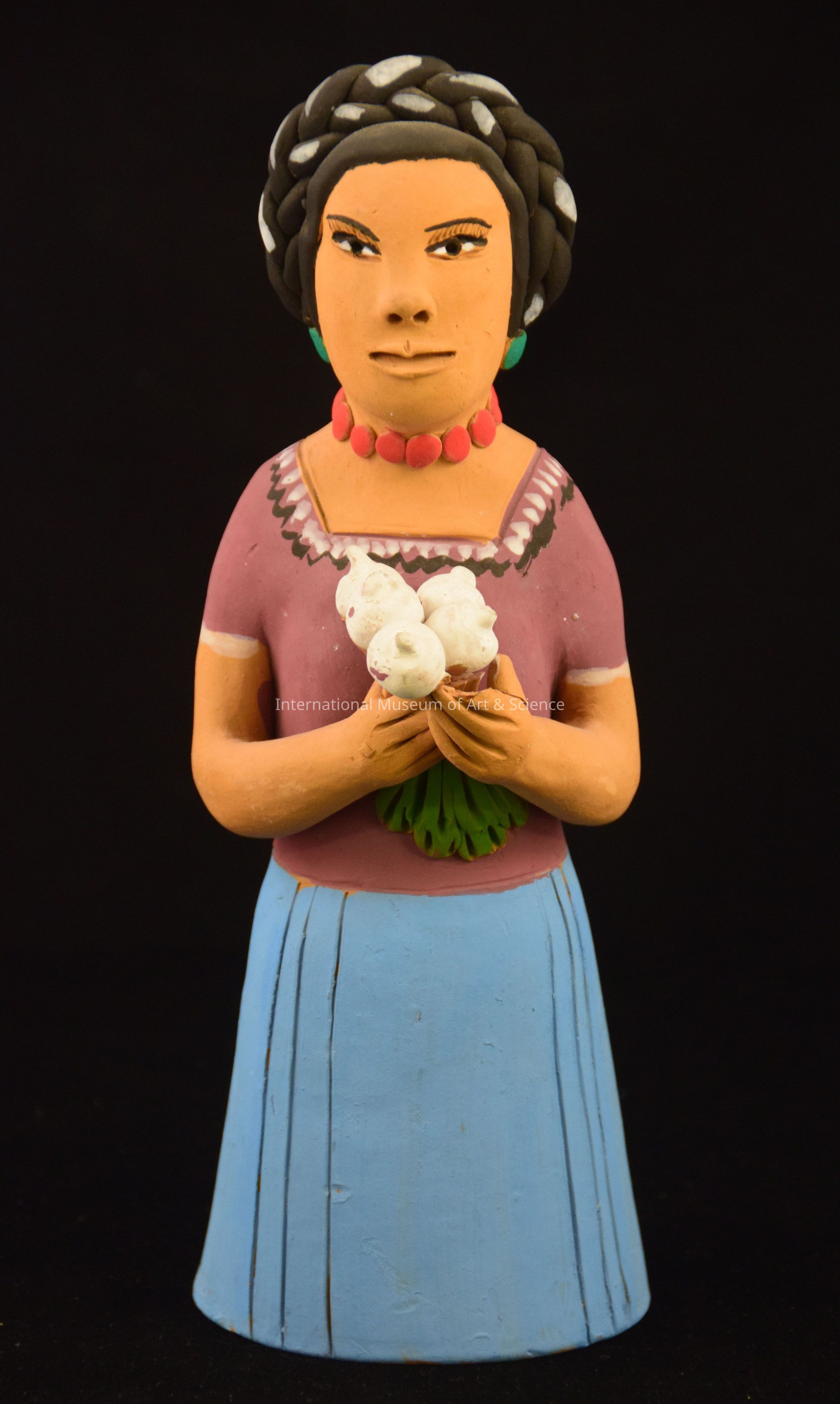 A ceramic figurine of a woman. The piece is painted to show the woman wearing a purple blouse, a blue skirt, and a red necklace. The figure is holding a bundle of onions.Ethnography