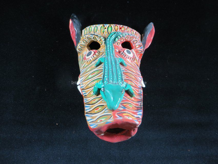 "Alligator mask with long snout". Black with red painted ears; green striped lizards on his nose; oval carved eye openings for wearer; face overall decorated with multi-colored oval designs; black chin, red mouth, face half brown, half red-orange, white eyeballs.Artwork Details