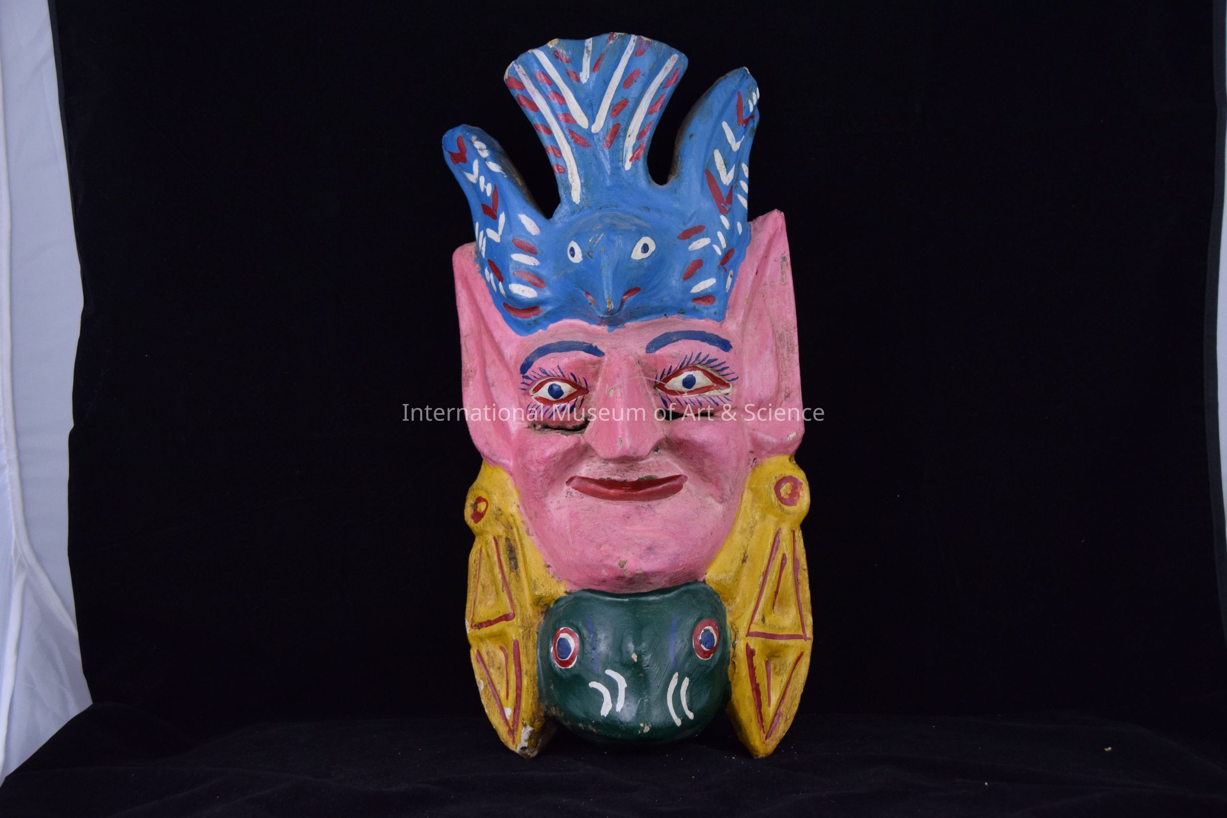Mask. Mexico, 20th Century. Multicolor stacked animal mask. Blue bird with white and red decorations on top, pink face with pointed ears and gold earrings in the middle and green frog(?) with white striping on the bottom.