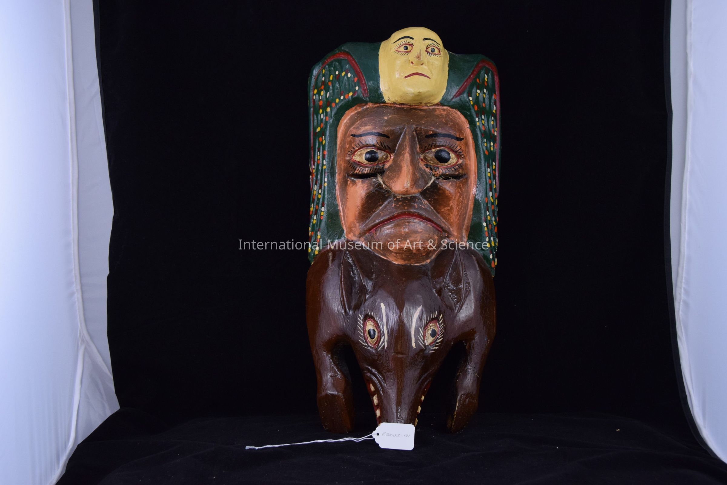 Mask. Mexico, 20th Century. Multicolor stacked animal and human face mask. Frowning face with decorative green hair/border with red, white, yellow, and orange dots at sides and small yellow face on top of head. Wolf creature at bottom with mouth open.