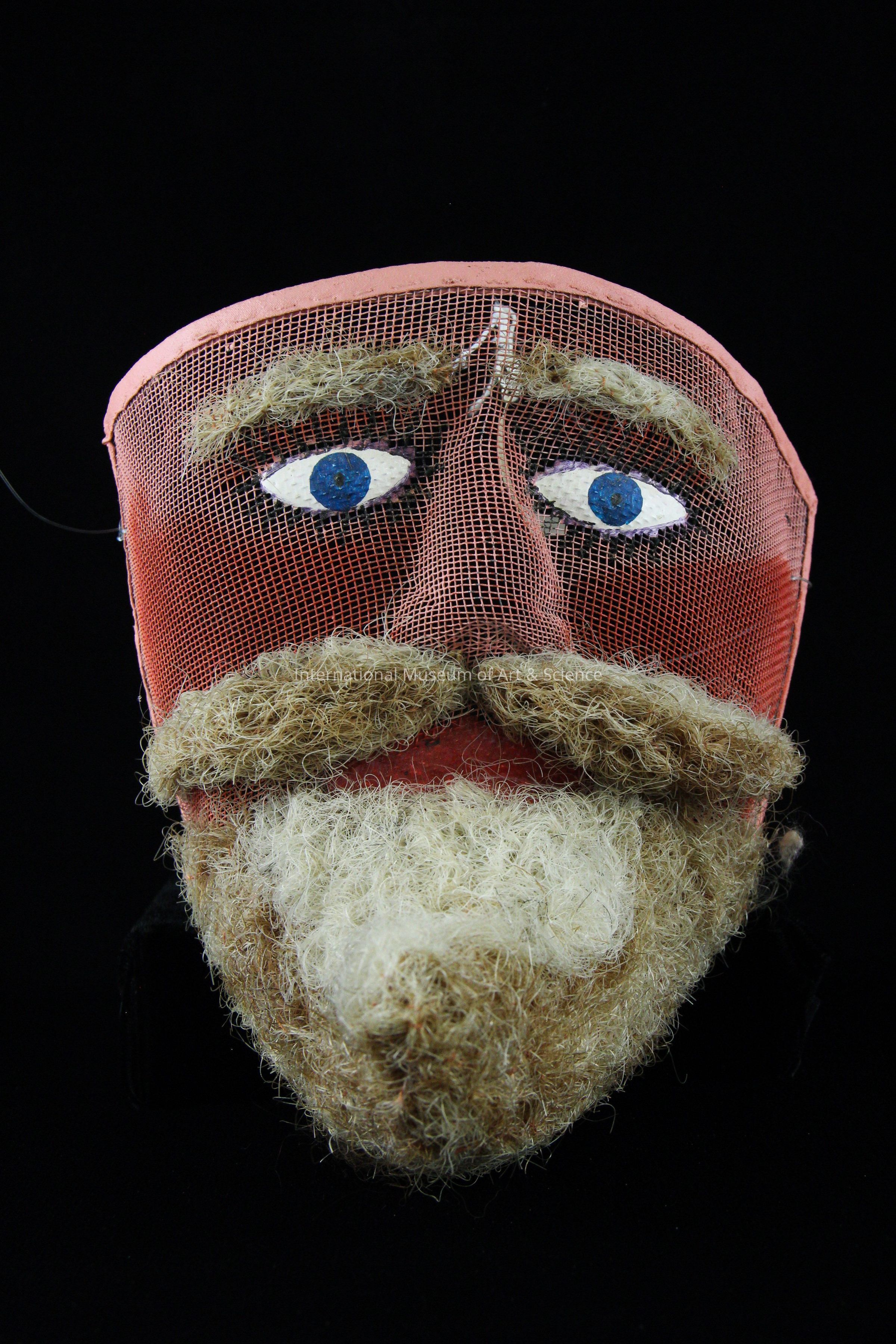A Chinelo mask from the Chinelos Dance costume. The mask is made from wire mesh with the eyes and mouth painted on. The facial hair attached to the mask is either rope threads or horse hair.