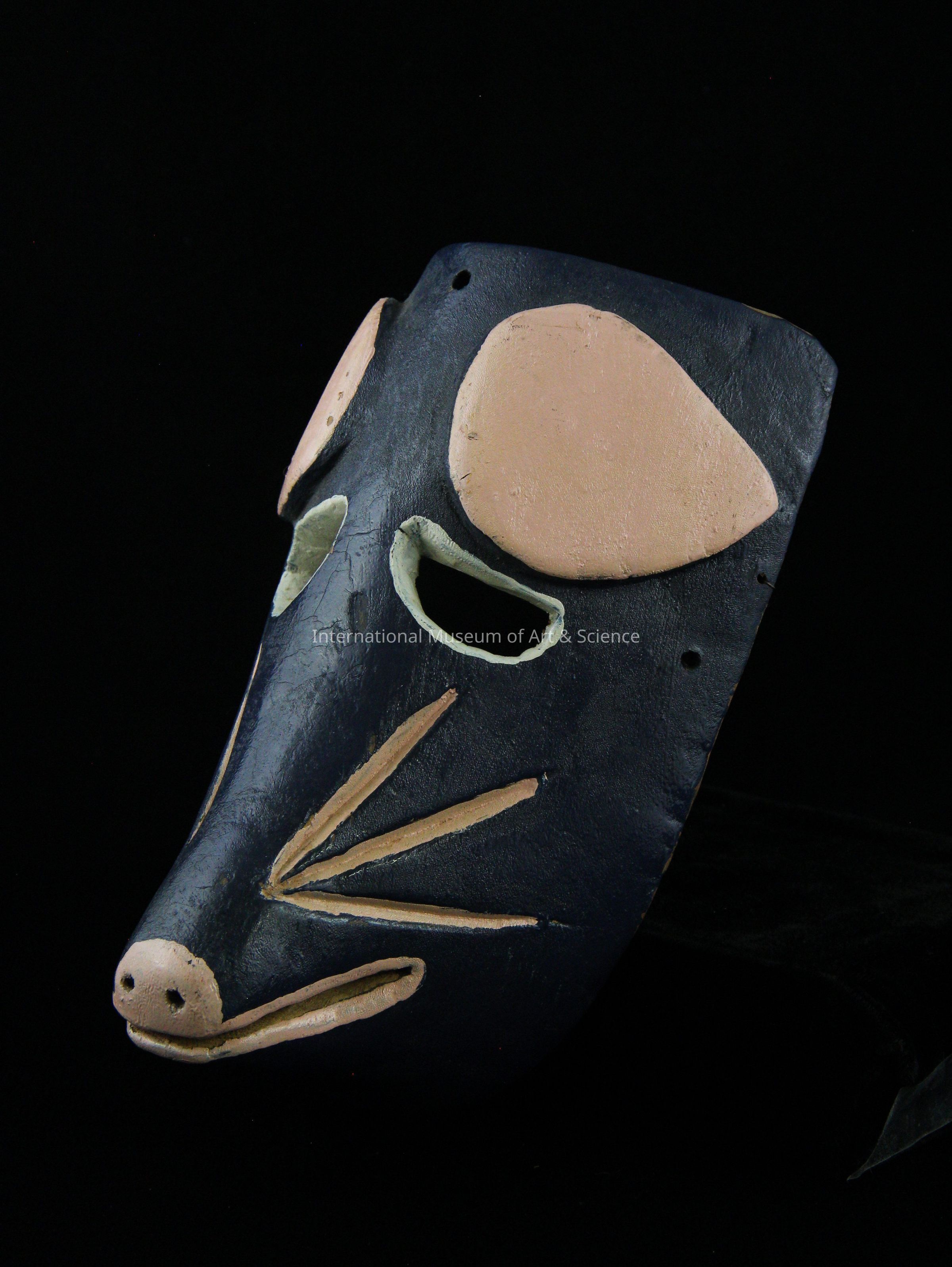A wood mask. The mask is carved to depict a pig face. The mask is painted a dark greyish blue with pink details.