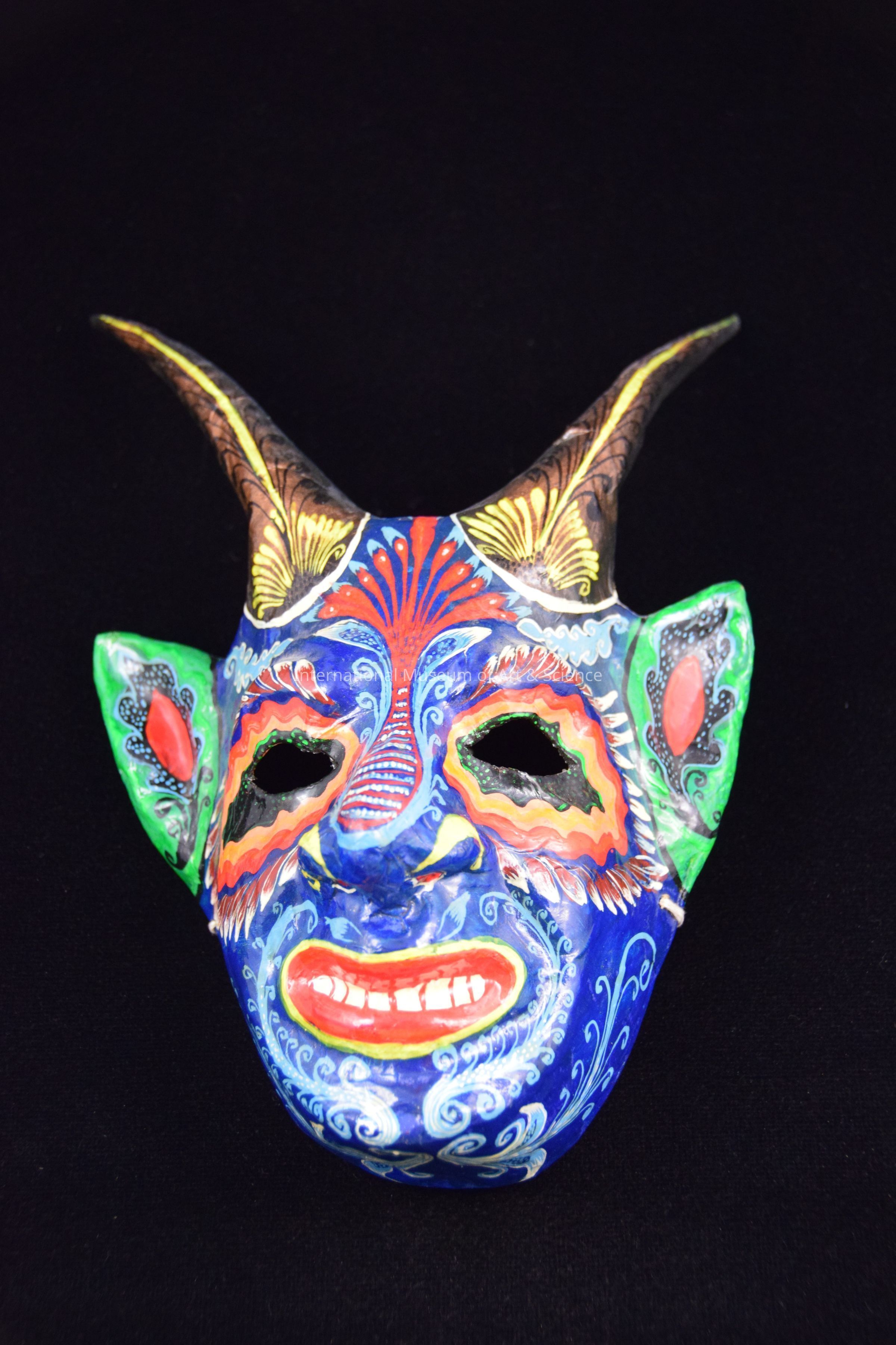 A papier-mache mask. The mask depicts a devil. The mask is vibrantly painted with various colors.Artwork Details