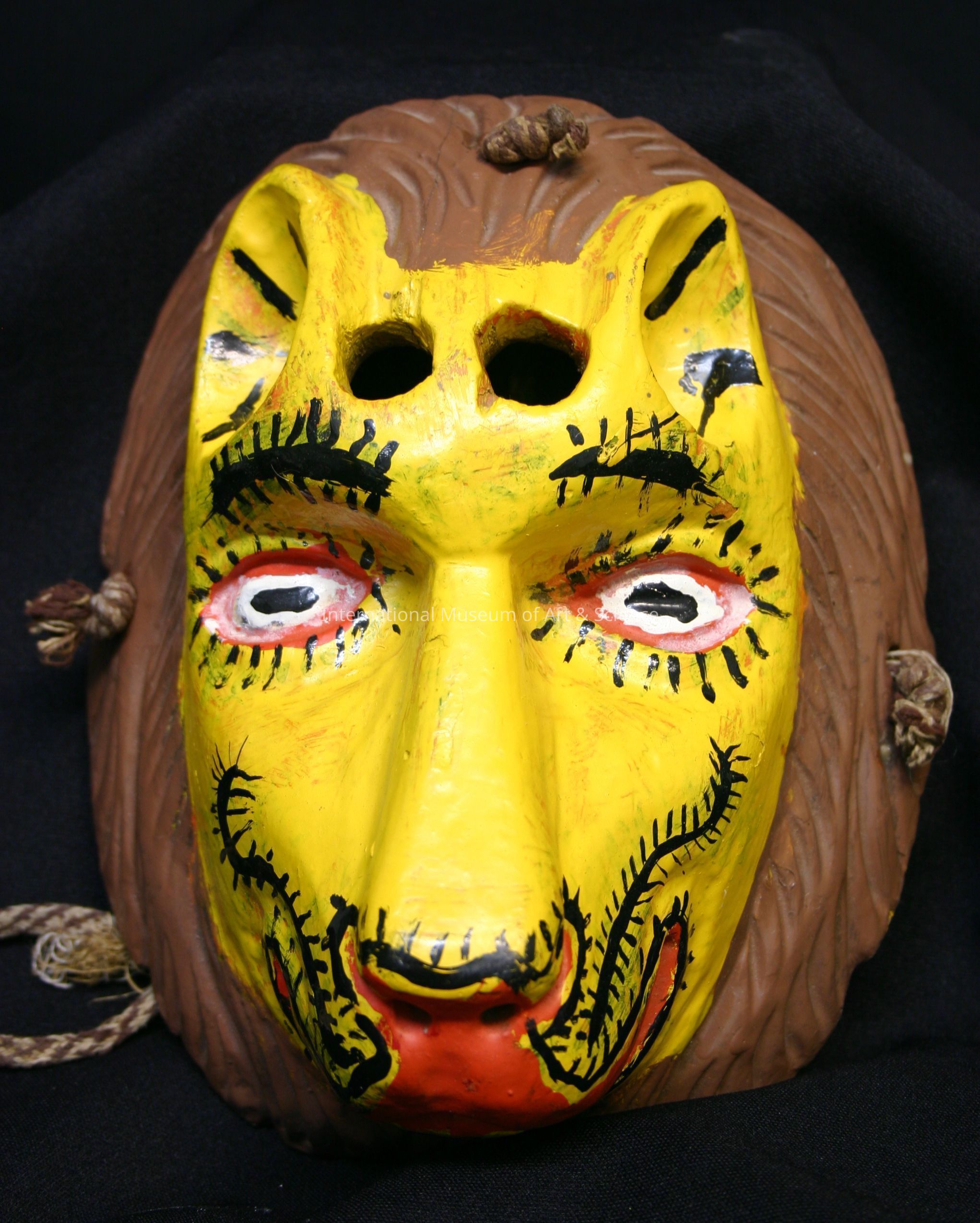 Lion mask. Lion face mask painted yellow with brown man; red-orange oval eyes, nose and mouth; long flat nose; concave ears.Artwork Details