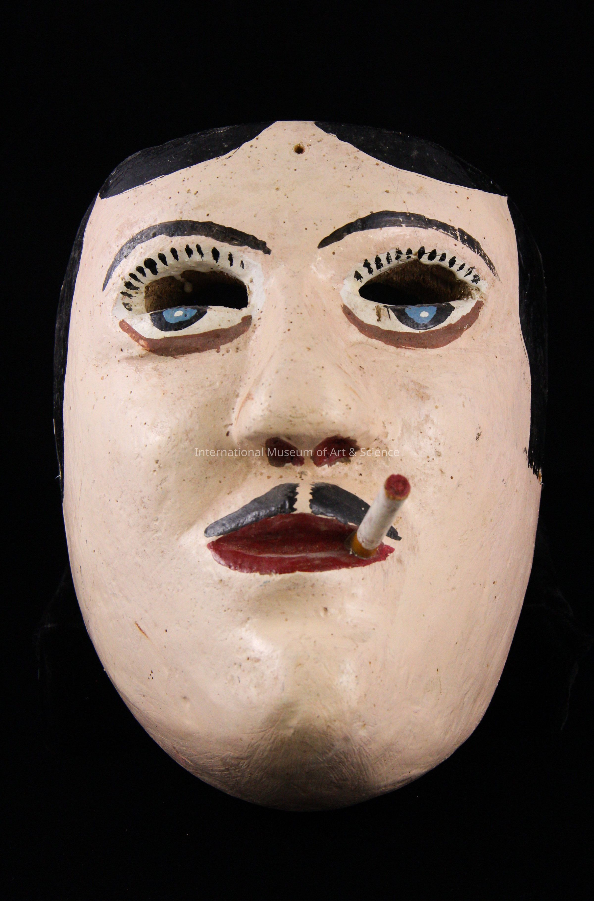 A wood mask. The mask depicts a man's face. The face is painted a fleshy pink color with black, red, and white details. The man has a cigarette hanging from his lips.Made/Created