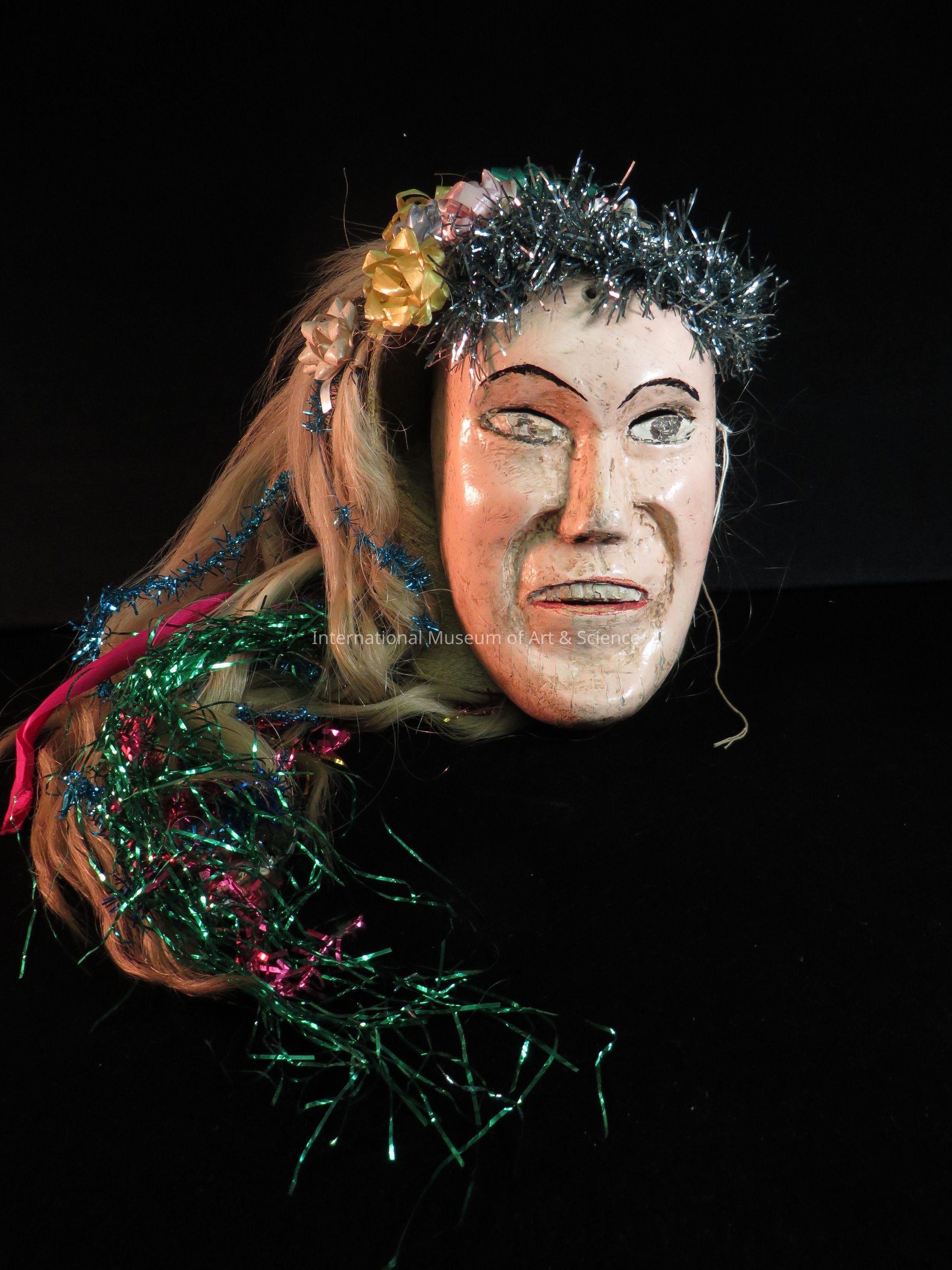 Mask. Light-complected face; blonde long hair; tinsel wreath with various colored ribbons in wig; base of straw.
