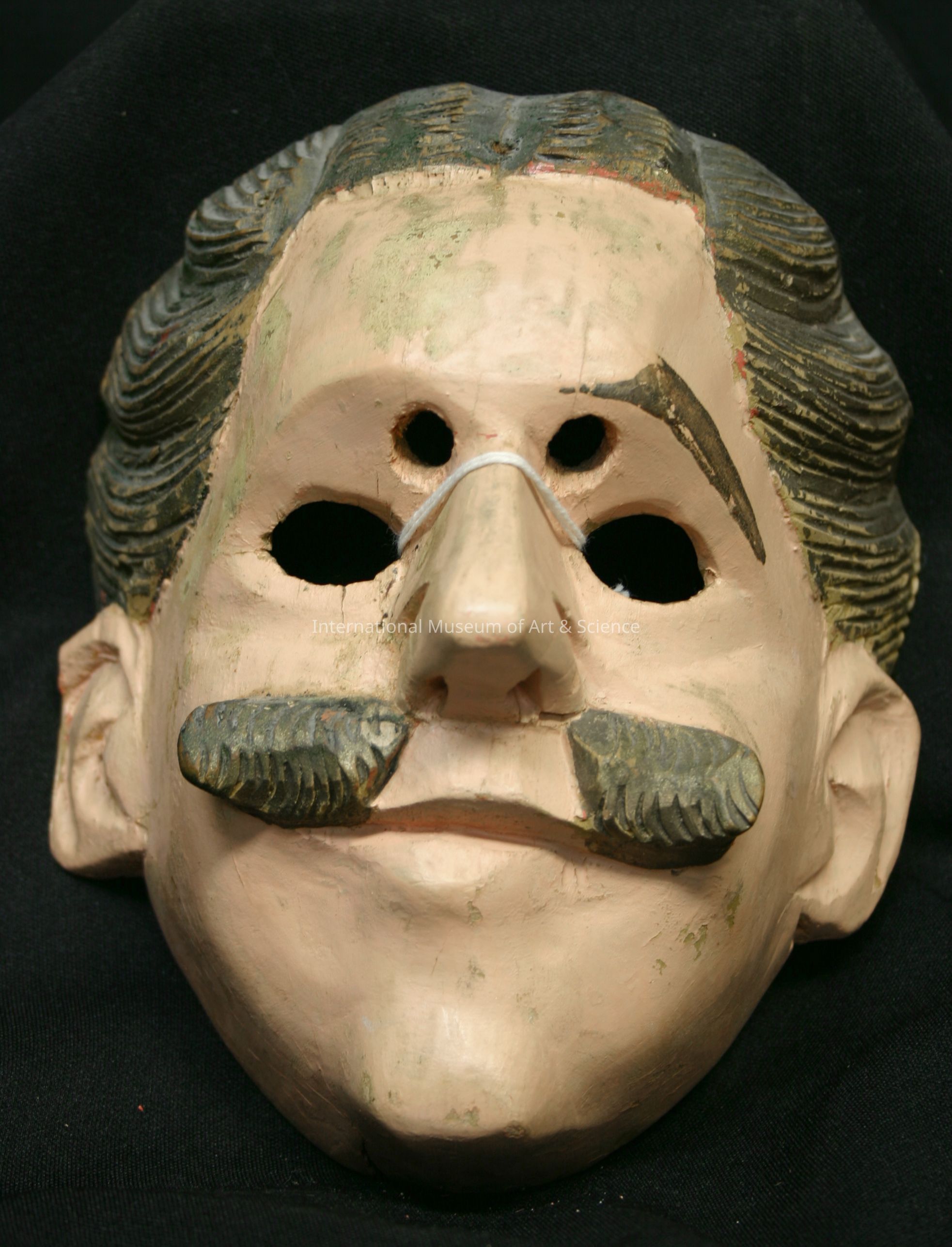A wood carved mask. the mask depicts a man's face. The face is painted in a peach flesh color. It had a brownish-yellow carved moustache, hairline, and a single eyebrow. There are holes carved for the wearer to see through.Dimensions