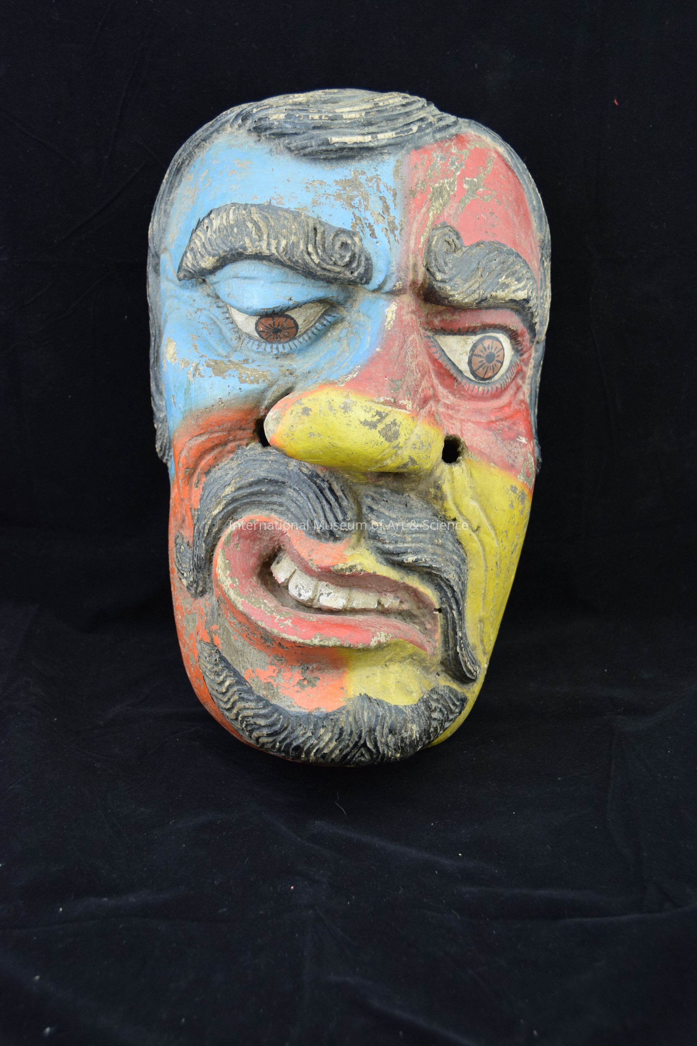 Mask. Mexico. Wood, paint. Face painted blue, orange, and red. Yellow nose and cheek; face distorted at left side with twisted nose and mouth.Dimensions
