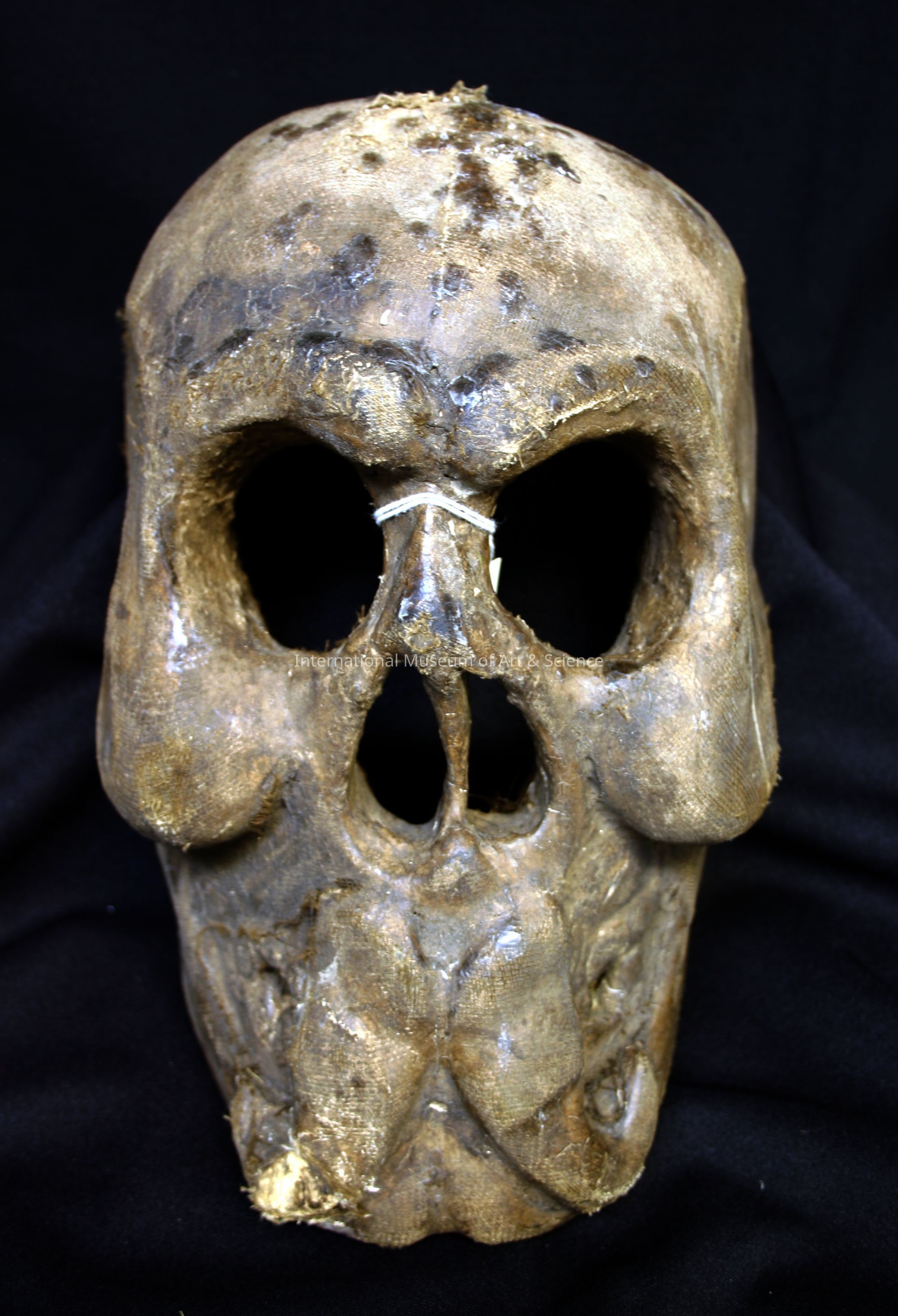 Mexican Skull Mask (male): carved wood covered w/ cloth.Candle drippings at top of mask. (Candle was used to illuminate face during dance.)Dimensions
