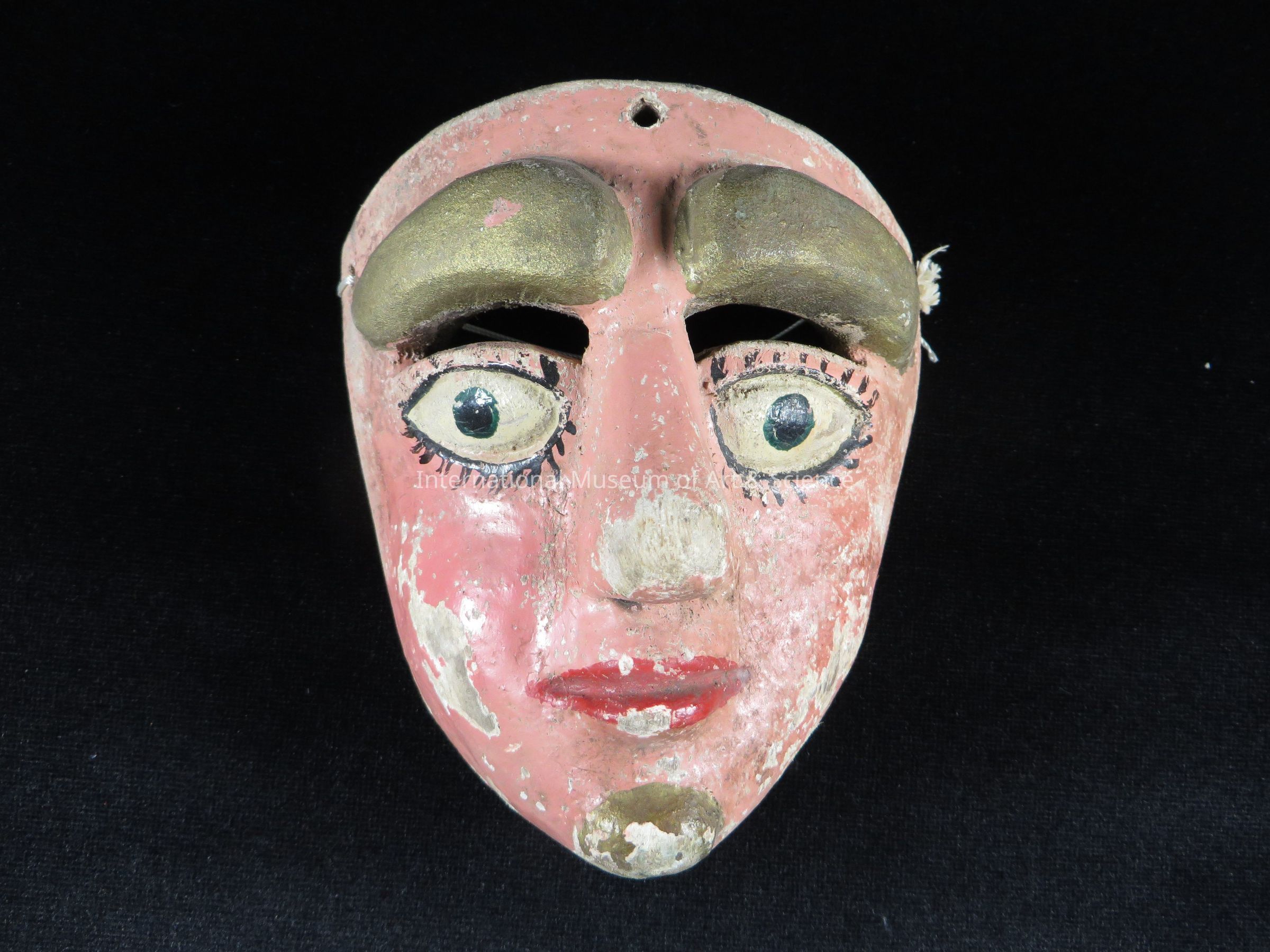 Mask. A pink face, large gold eyebrows, carved in relief.