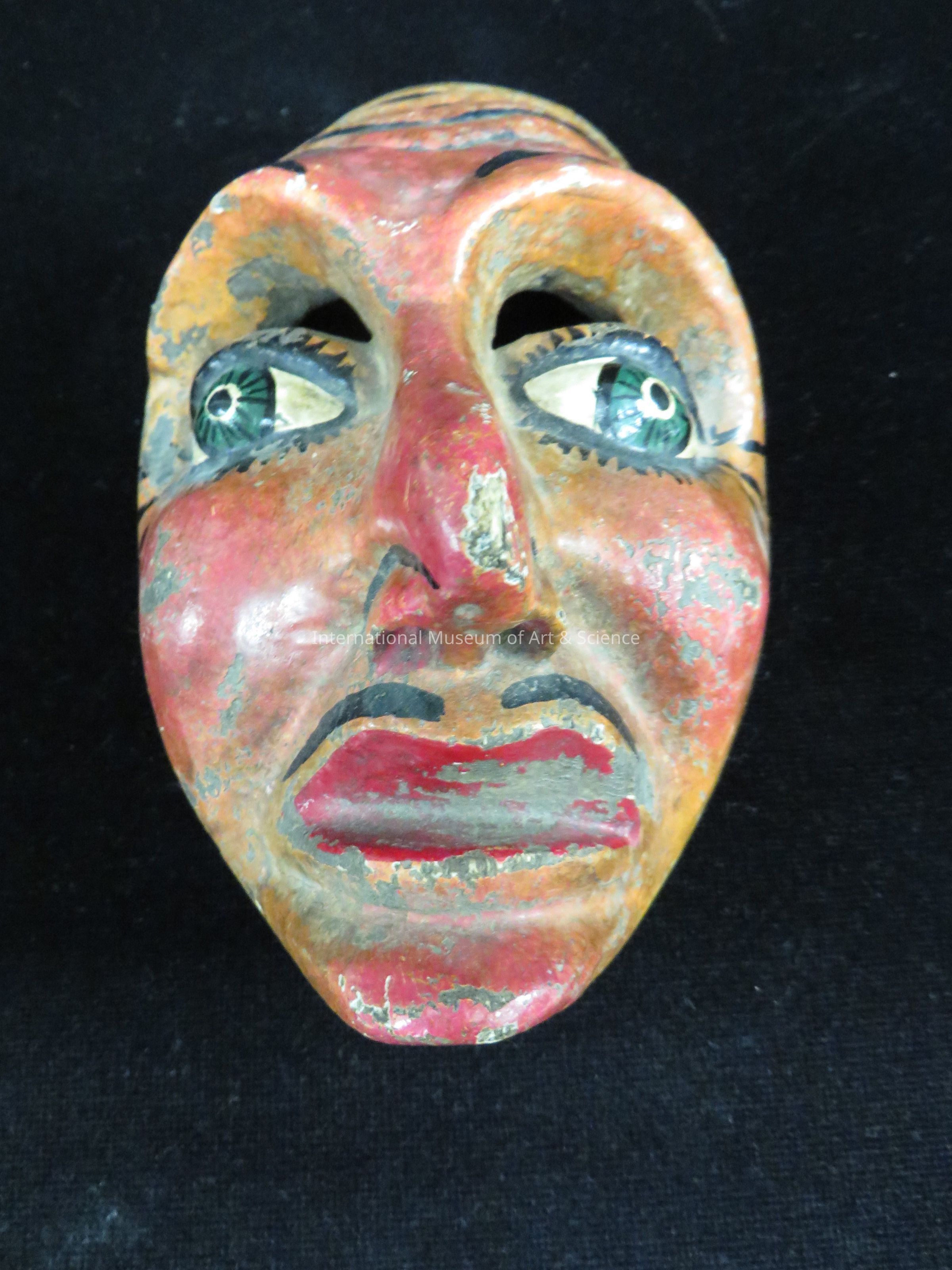 Mask, Red face; fine black painted moustache; blue eyes; black lines on forehead.