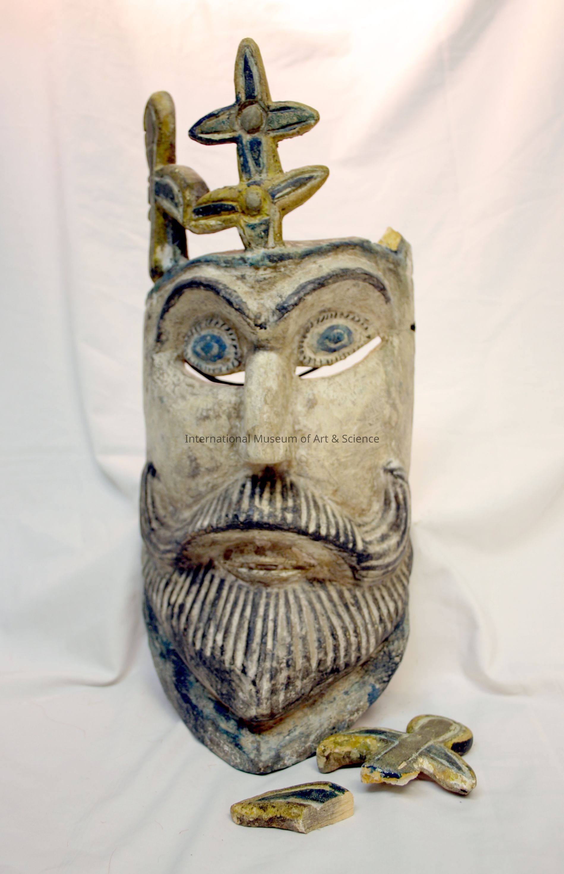 Large wooden face mask-Painted light (white/creme) skin tone,with large blue eyes. Face is unexpressive. Large black mustache and beard. Small mouth. Crown on head, painted in yellow,aqua,and black.Dimensions