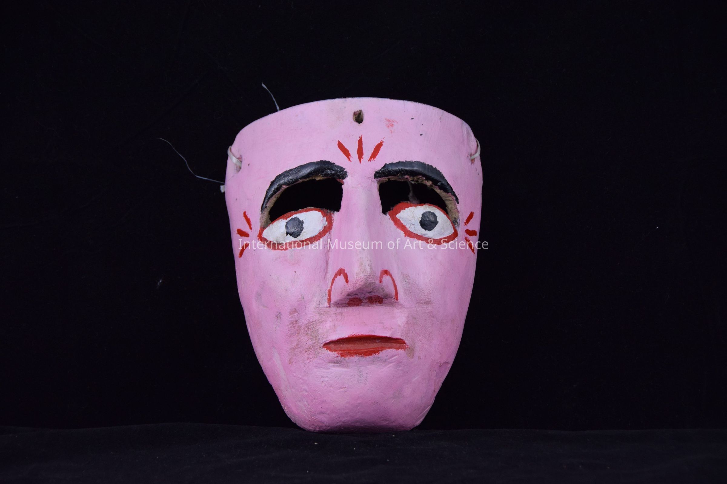 A wood carved mask. The mask depicts a man's face. The skin is painted pink, with red details on the lips and eyes. The face has black painted eyebrows. There are carved slits between the eyes and the eyebrows for the wearer to see through. The mask is of a Mecos character. There is a plastic string attached to the back of the mask.Artwork Details