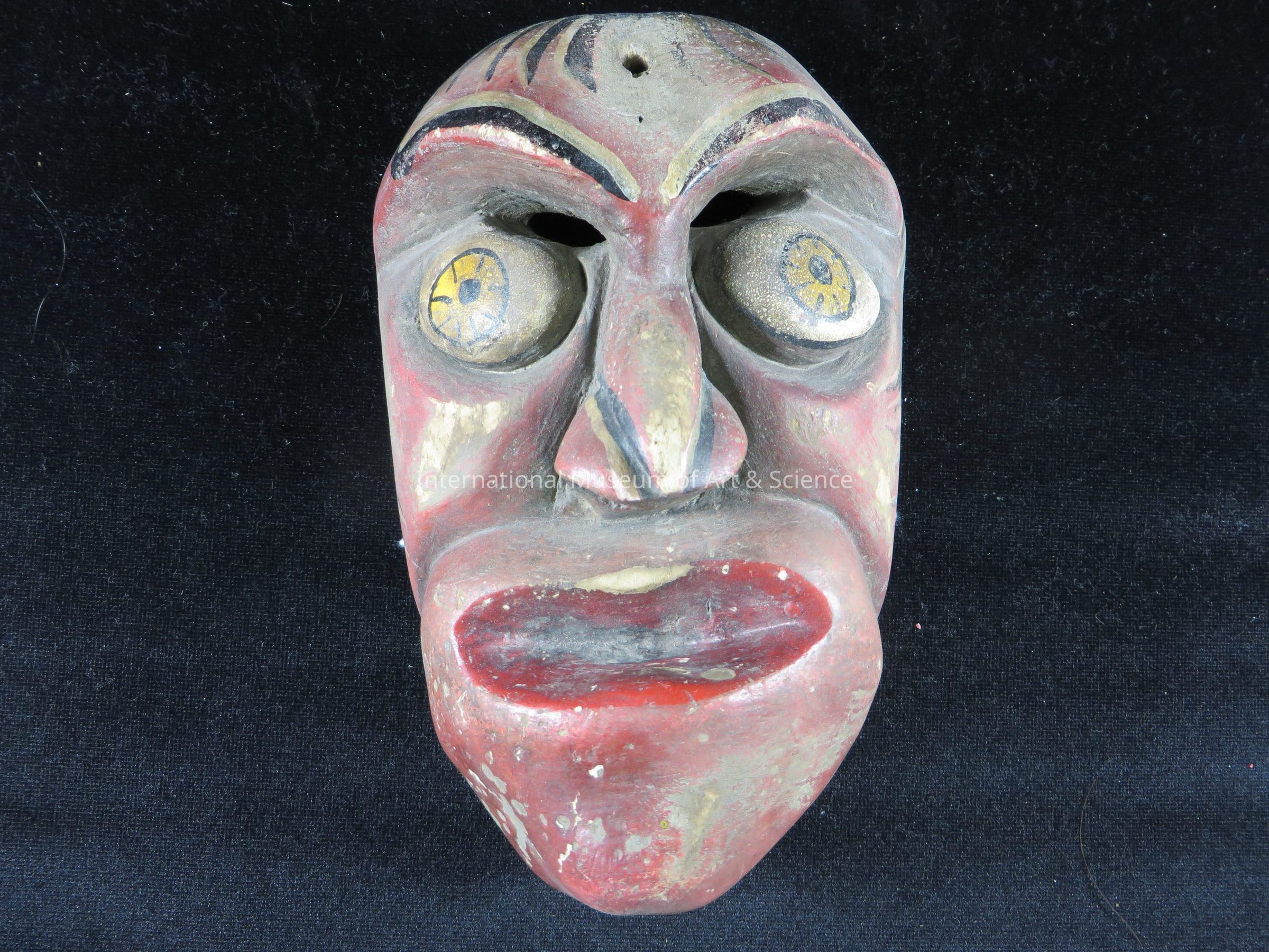Mask. Red Face, enlarged lower jaw and mouth; eyes painted yellow with black pupils; openings above the wearer. black and silver hair and eyebrows.Dimensions
