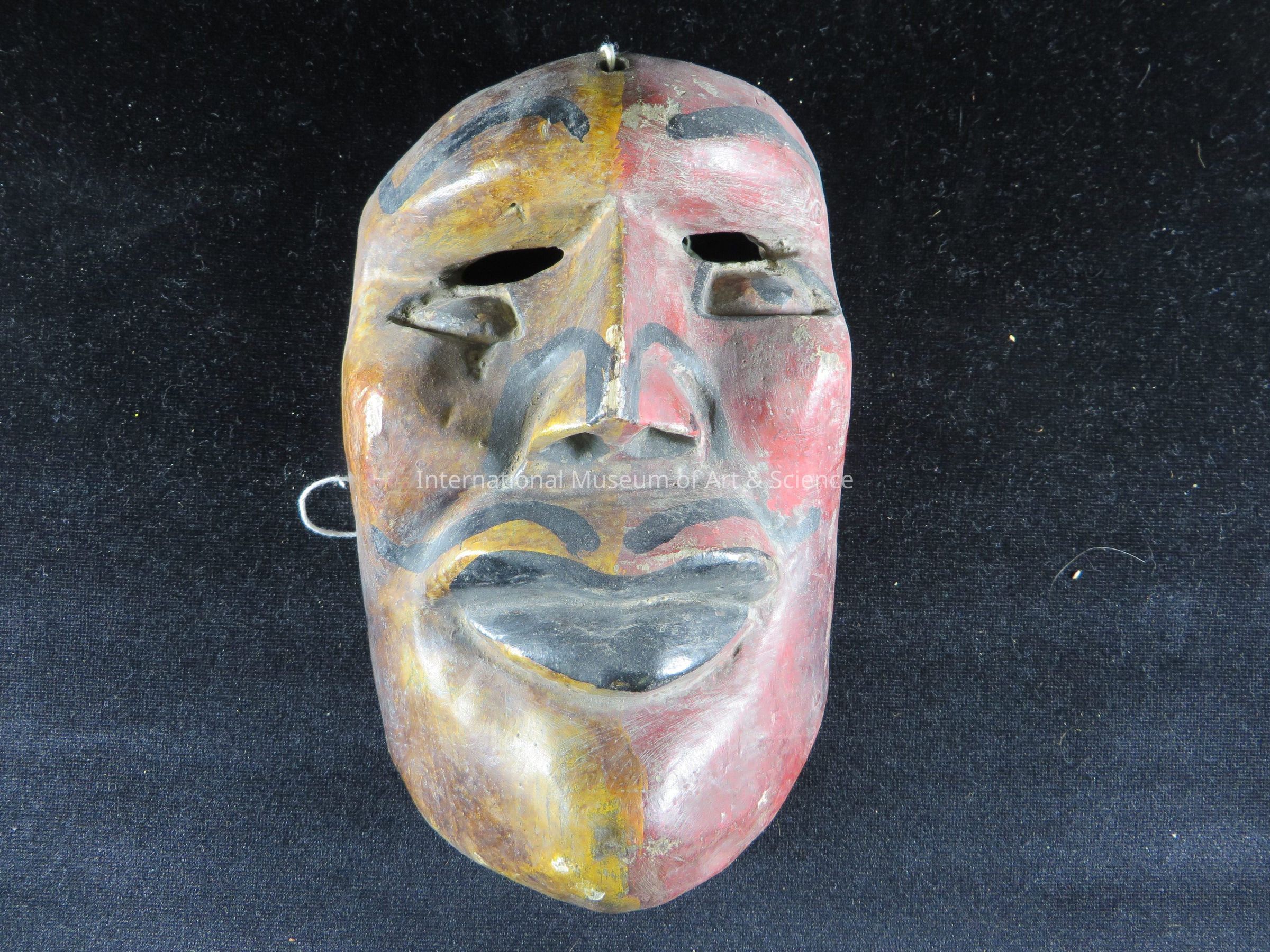 Mask. Guerrero, Mexico. Wood, paint. 20th c. Carved face painted half red - half yellow; black painted moustache, eyebrows, eyes, lines around nostrils. Sharp nose, projecting forehead and chin. Hole penetrates each outer edge for attaching ties, one at center top.
