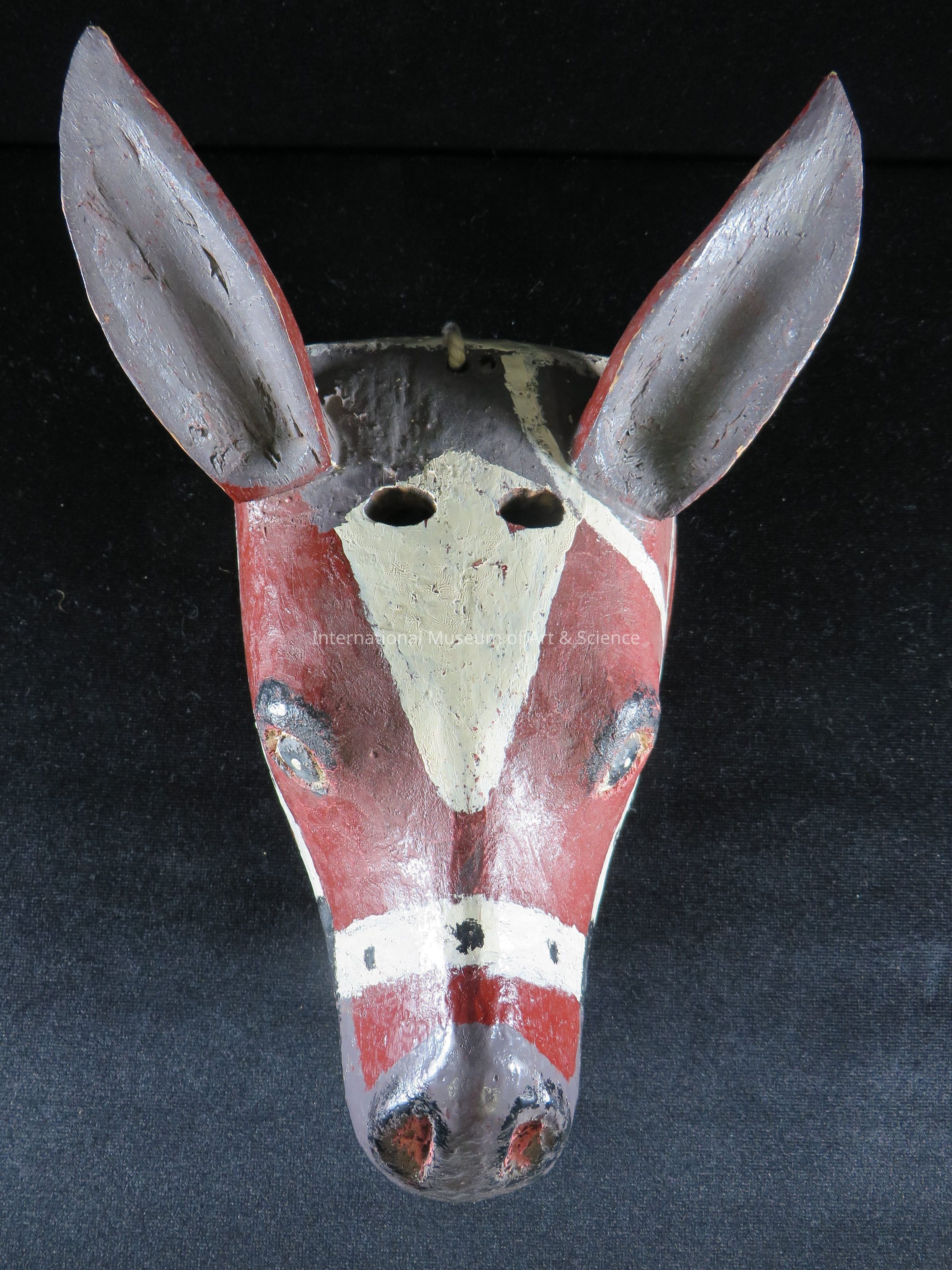 Horse mask. Smoothly carved to narrow nose w/ nostrils, mouth incised. Ears carved from same piece of wood. Eye ovals cut between ears. Detailed painting, red ground w/ black and white halter, gray ears, mane, nose.Dimensions