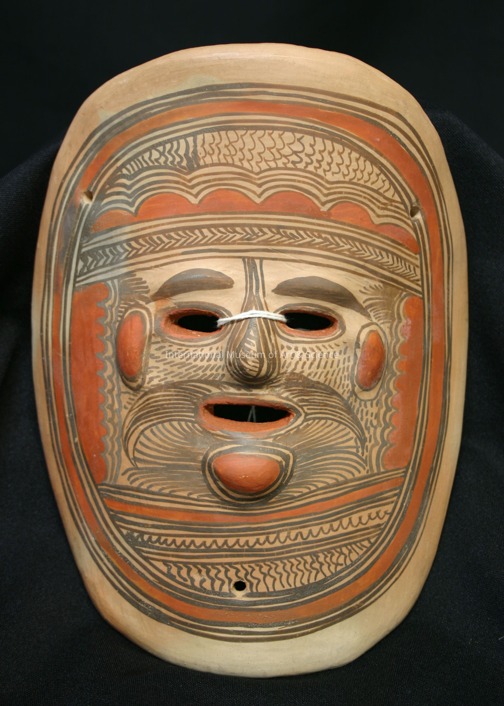 Oval decorative mask; oval perforations as eyes and mouth; convex nose, cheeks and chin; orange and brown designs; three small holes; unpainted back.Dimensions