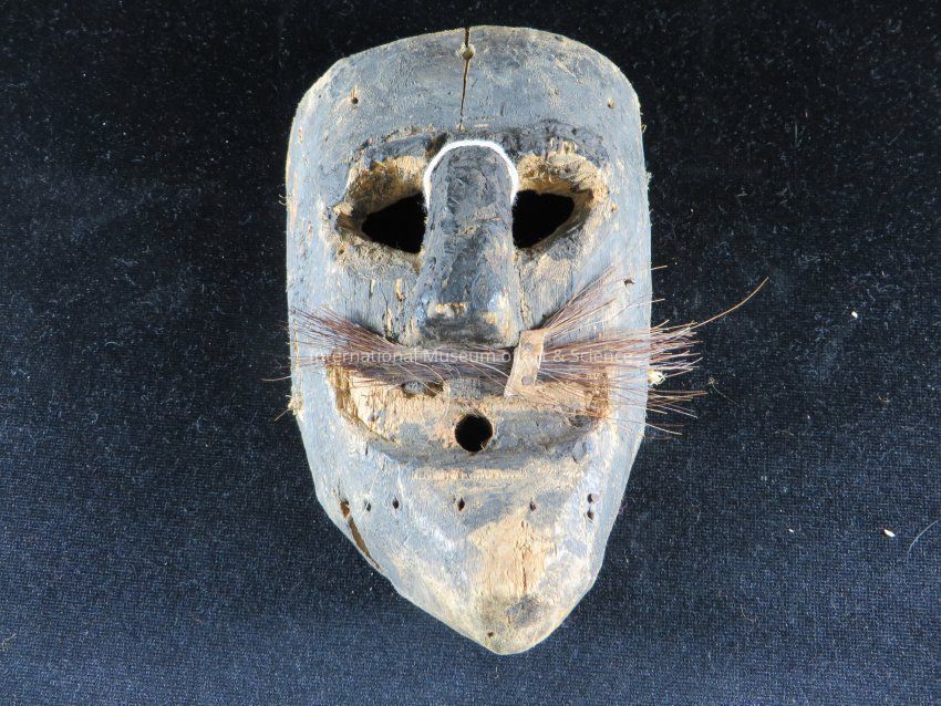 A wood carved mask. The mask depicts the face of a man with an animal hair mustace.